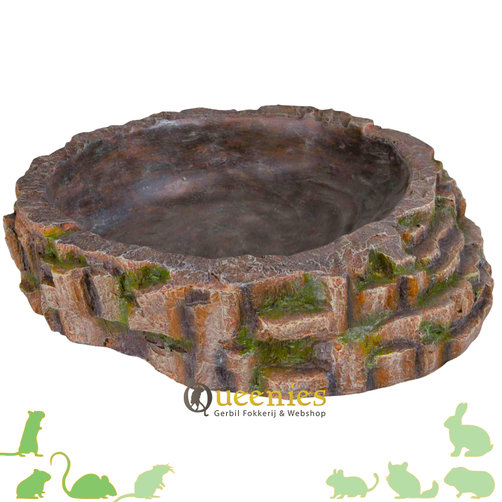 Een zeer ruime badzand schaal in regenwoud look gemaakt van polysterhars. Gemakkelijk schoon te maken en geeft een natuurlijke uitstraling aan uw gerbil habitat. Hoe meer oppervlakte de gerbils als badschaal hebben, hoe minder ze het eruit schoppen, maar echt gebruiken om in te badderen. Dit is een serieuze grote afmeting. Ter vergelijking: Deze schaal past enkel in het meter Gerbilarium op het linker grote plateau. Dan past hij net. Overweeg deze schaal enkel als u de afmetingen goed nagemeten heeft in uw gerbilarium. Past het dan? Twijfel dan niet langer, want prachtig mooi is hij zeker!