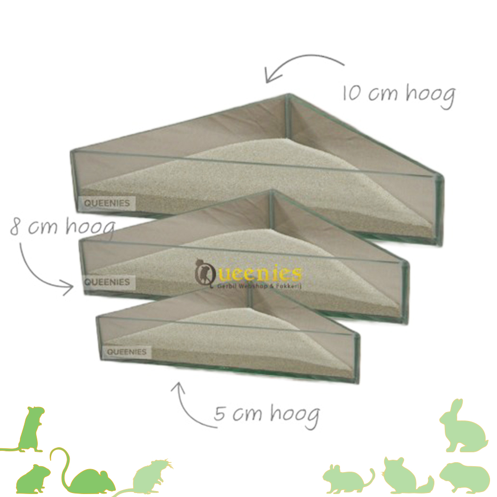 Afmetingen: 20x20x5│20x20x8│20x20x10 ( 10 cm hoog is net zo hoog als onze vierkante badzandschaaltjes van Queenies ) Geschikt voor: Gerbils, Hamster, Dwerghamster, Muis.