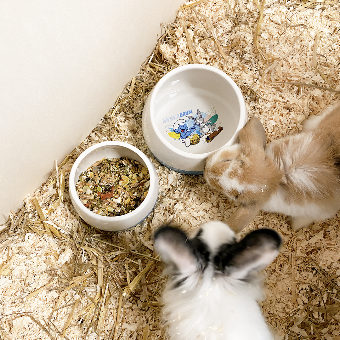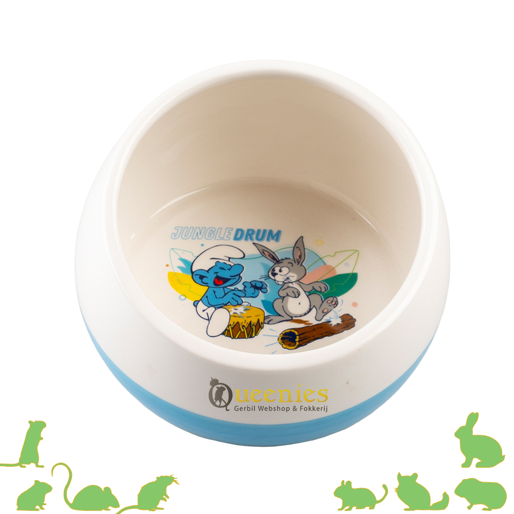 The Smurfs en Duvoplus smurfen de handen in elkaar! Geïnspireerd door de avonturen en personages uit de nieuwe Smurfen serie werd er een tof, uniek en grappig assortiment ontworpen. Deze keramieken zandschaal voor gerbils, of eetkom voor konijenen is voorzien van met muzieksmurf en het konijn is vervaardigd uit gebakken aardewerk en dus heel stevig en stabiel. Dit model met aflopende rand zorgt voor een optimale toegankelijkheid tot het eten of drinken en vermijdt buitensporig mossen. Ook zal het zand niet zo snel morsen als u het gebruikt als zandschaal voor gerbils. Dankzij de kwalitatieve afwerking met glazuur is de kom zelf waterdicht om drinken in te serveren én zeer gemakkelijk schoon te maken. De leuke opdruk maakt het geheel af en garandeert een smurftastic maaltijd voor je konijn of knaagdier. Afmetingen 15x15x10 wat gelijk is aan 800 ml