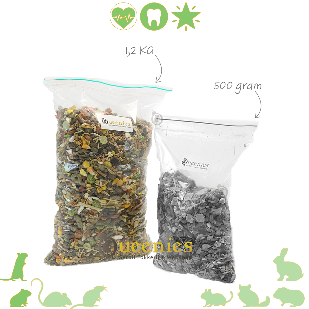 De voeding voor gerbils van GerbilShopQueenies.nl is met zorg en uiterste precisie samengesteld voor zwangere en zogende Gerbils, jonge puppies en natuurlijk de normale knuffel Gerbils. Door verschillende soorten basisvoeding voor Gerbils door elkaar heen te mengen krijg je de meest complete mix die er is. Iedere voeding heeft zijn eigen specialiteiten. Deze heeft GerbilShopQueenies voor u samengebracht, gemengd en opnieuw verpakt. Een smakelijke mix die door vele Gerbils goed gegeten wordt. Tevens het gerbilvoer ( samen met de Complete Mix de Luxe voor gerbils en dwerghamsters ) die Gerbilfokkerij Queenies ook gebruikt voor al zijn Gerbils.