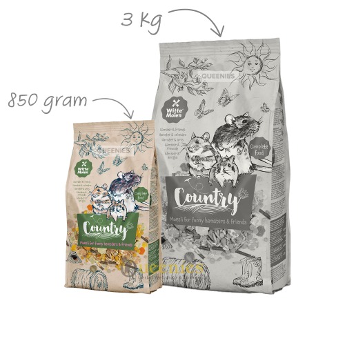 De Country hamster & vrienden is verkrijgbaar in 2 verschillende afmetingen, 850 gram verpakkingen en 3 kg verpakkingen.