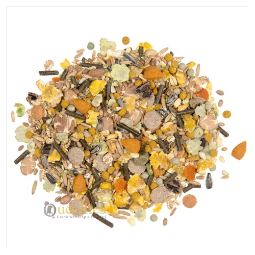 Goed en evenwichtig voer met wortelen en lekker fruit. Verrijk het met gedroogde bloemen en kruiden die ook online in onze webwinkel worden aangeboden.