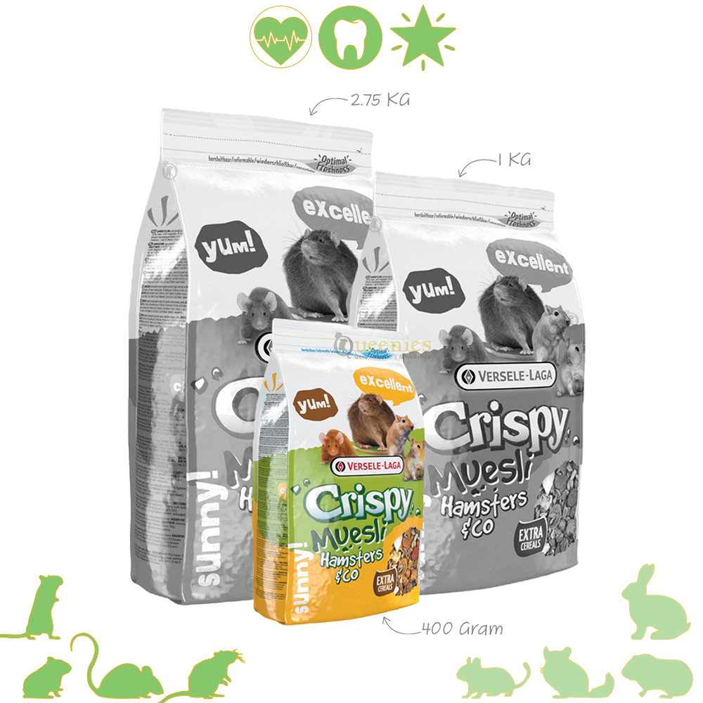 Het Versele-Laga Crispy Muesli voor Hamsters & Co ( en vriendjes ) is een goede basisvoeding met veel eiwitrijke kwaliteits ingredientenmix met een grote variatie. Geschikt voor Gerbils, Muisjes, Ratten maar ook voor Hamsters zoals Dwerghamster en Goudhamster.