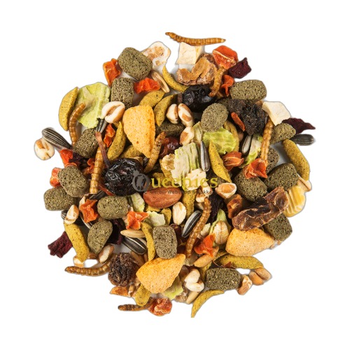 Samenstelling: granen (2% gepofte rijst), plantaardige bijproducten, groenten (1% paprika), zaden (3,5% zonnebloempitten) vruchten (2% rozijnen), noten, vlees en dierlijke bijproducten (1% meelwormen), oliën en vetten, mineralen