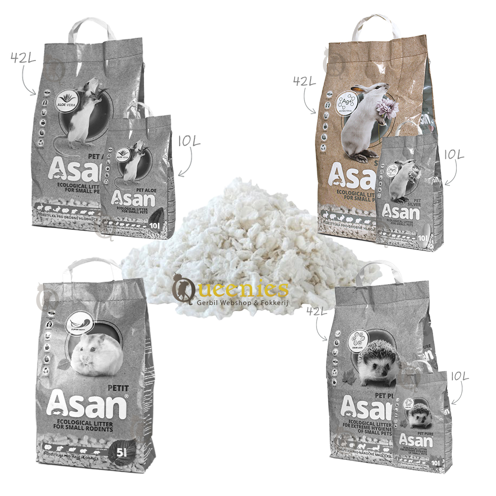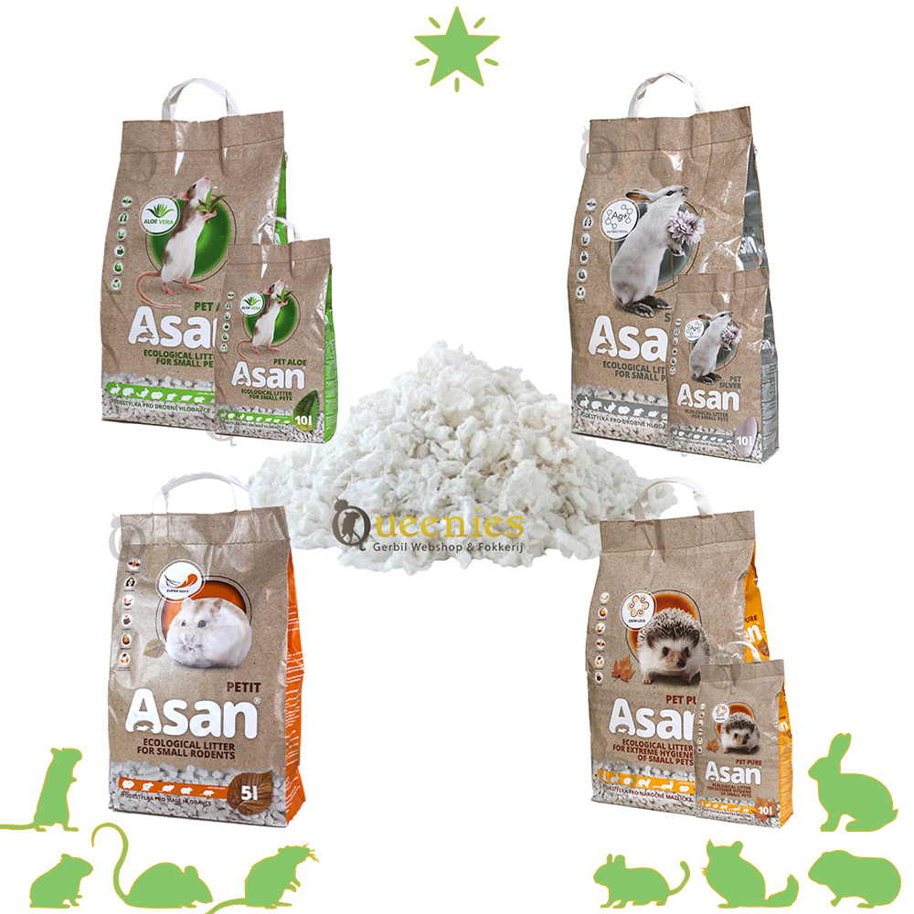 Asan Pet Aloe staat een Rat op afgebeeld en ook deze is weer leverbaar in 10 of 42 liter verpakkingen in een handige draagtas. Aan dit product is subtiel Aloe Vera toegevoegd. Positieve eigenschappen van Aloe Vera zijn dat het de stofwisseling stimuleert, het immuunsysteem verbertert, algergieen vermindert en helpt bij een goede ademhaling / luchtwegen. Deze variant bevat enkel Aloe Vera, maar ook hierbij moeten we wel onderstrepen dat de eigenschappen van Aloe Vera symboliseert waarvoor Asan Carefresh Bodembedekking staat.