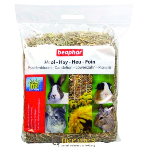 Beaphar Hooi is zorgvuldig geselecteerd en aangevuld met paardenbloemen. Hierdoor ruikt en smaakt het hooi extra lekker. Hooi zorgt voor een goede spijsvertering en daarom moet er altijd voldoende hooi ter beschikking zijn. Gerbils knagen aan het hooi en slijten daardoor hun snijtanden, wat goed is voor het gebit. Dit hooi is geschikt voor alle knaagdieren en konijnen zoals Cavia's, Chinchilla's, Degoes, Ratten, Muizen, Goudhamsters en Dwerghamsters.