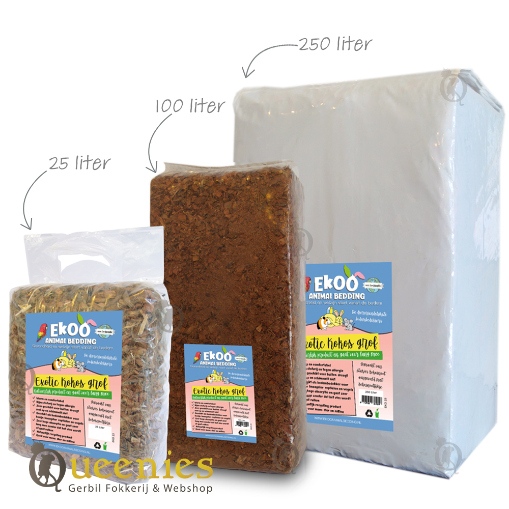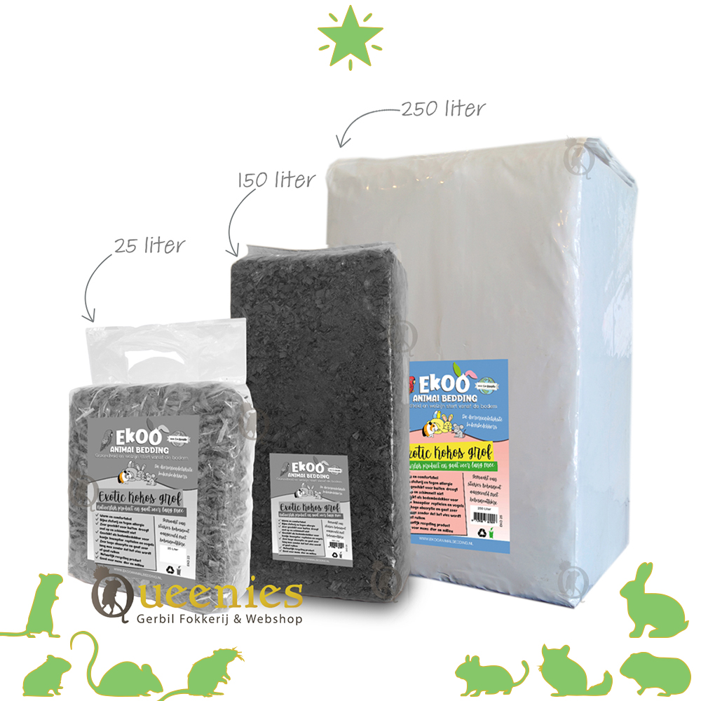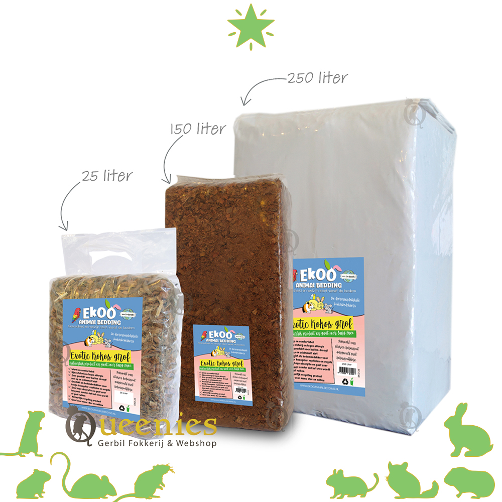 De Exotic kokos fijn 25 - 250 LTR van Eko Animal Bedding is een natuurlijk product wat lang mee gaat! Dit product gebruiken wij ook in onze Gerbilfokkerij. Deze bodembedekking is gemaakt van kokosschilfers en vaak ook nog stukjes barst. De houdt in dat het een mooie mix is van de binnenkant van de kokosnoot en de buitenkant van de kokosnoot. Dat maakt de Exotic Kokos fijn en erg stevig wat dan weer bevorderlijk werkt voor het graven van gangetjes en het maken van holletjes voor uw lieve knagertjes. Deze bodembedekker is zeer sterk absorberend ( tot 8x zijn eigen gewicht ) en geeft het verblijf ook nog een zeer natuurlijke uitstraling. Ook is kokos stofarm wordt er gezegd, daardoor geschikt voor gevoelige dieren. Onze ervaring is iets genuanceerder. De Exotic Kokos fijn is stoffiger dan soort gelijke bodembedekkers.