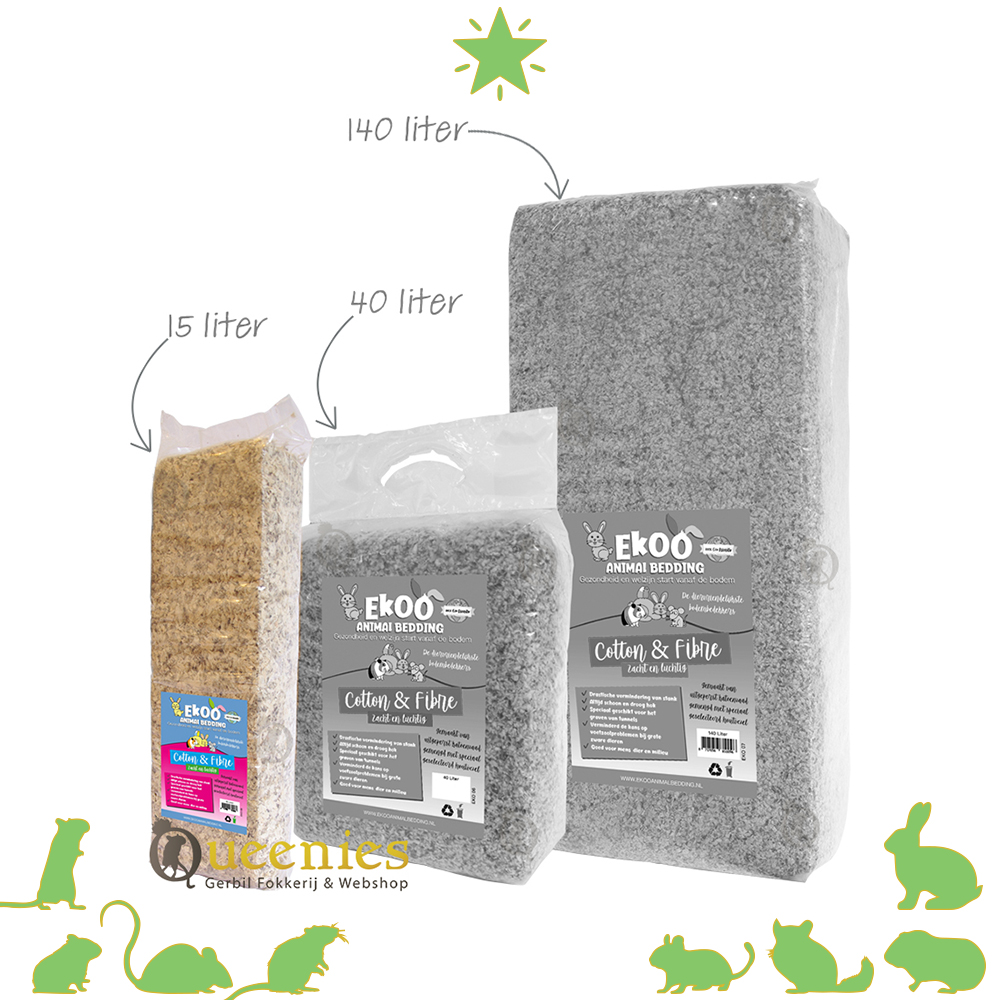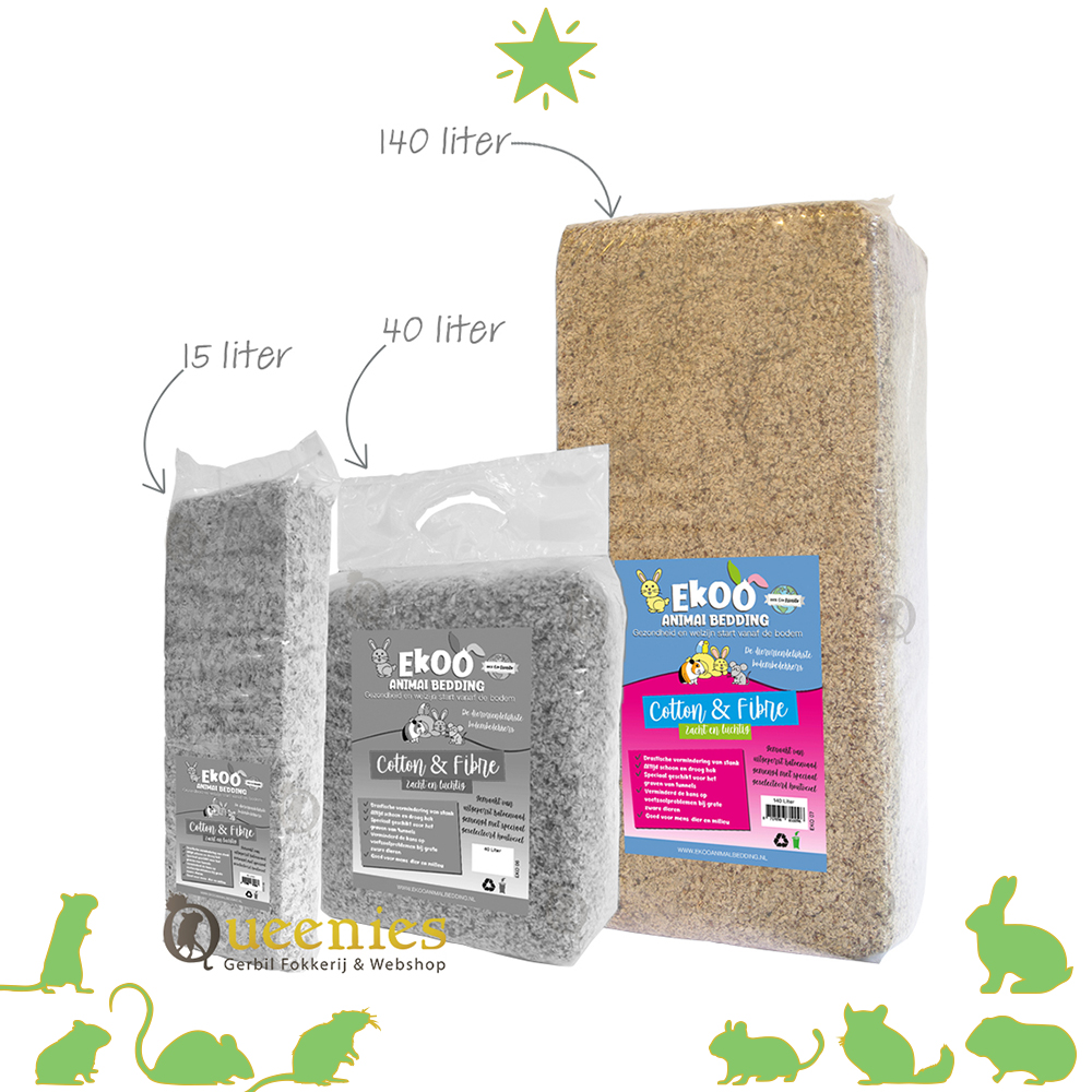 Cotton & Fibre is een luchtige en zachte bodembedekking voor Gerbils, cavia's, dwerghamster of goudhamster en konijnen tot muizen. Het is gemaakt van uitgeperst katoenzaad ( Cotton & Comfort ) en gemengd met een speciaal geselecteerde houtvezel. Dankzij het hoge absorptievermogen van deze bodembedekking van Eko Animal Bedding houdt uw huisdier een droog en schoon verblijf met deze Cotton Fibre. Tevens worden vieze geuren van de uitwerpselen verminderd. Het product is stofvrij. Kleine knaagdieren, zoals Hamster en Gerbil kunnen Cotton & Fibre bovendien gebruiken als nest en speelmateriaal.