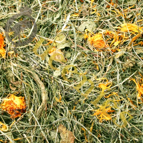 Samenstelling: Hooi, Goudsbloem 2,5% en Paardenbloem 2,5%