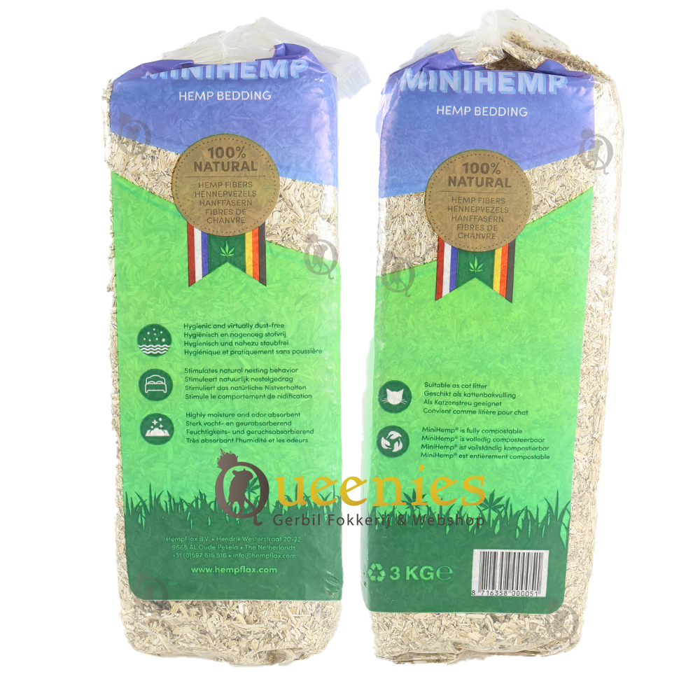 Bij Gerbilfokkerij Queenies adviseren we Mini Hemp te combineren met Cotton comfort. Als toplaag voegt u de Exotic kokosvezel en/of Queenies Bosmix daar nog aan toe. De bosmix kunt u gebruiken als vervanging van de Exotic kokosvezel en vice versa. Als vervanging van de Cotton Comfort kunt u ook Cotton Comfort de Luxe gebruiken. Dit is een mengsel van Cotton & Comfort, Theezakjes en zaagsel. Vooral de Teabags zijn een echte hit bij Gerbils en Hamsters. Hiervan kunnen deze dieren onwijs lekkere nestjes bouwen die heel comfortabel liggen. Zorg er dus altijd voor dat u de Theezakjes in huis heeft en los erbij besteld!