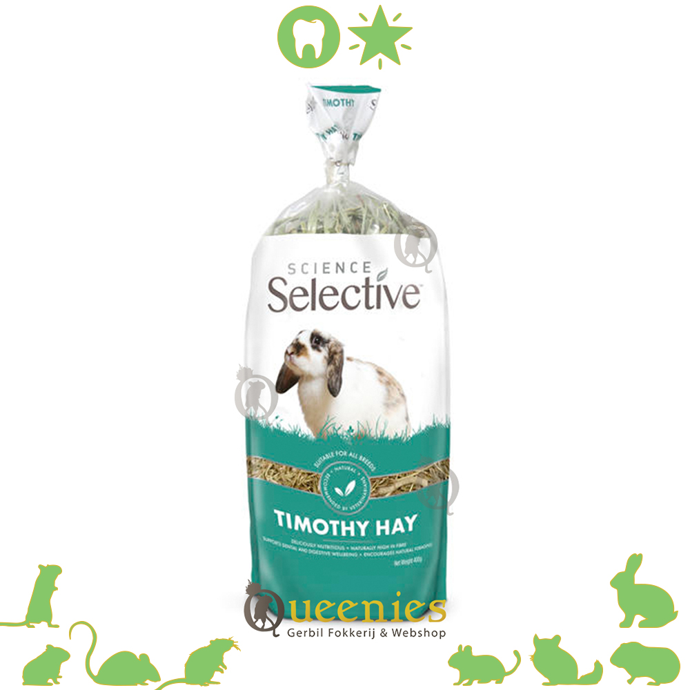 De Science Selecive Timonthy Hay is een heerlijk ruikend, smakelijk hooi met lange vezels ter bevordering van de spijsvertering en de natuurlijke gebitsslijtage bij Knaagdieren en Konijnen. Dit Timothy hooi is biologisch gekweekt en met de grootste zorg en zorgvuldigheid geselecteerd en met de hand verpakt. Alleen het allerbeste hooi wat beschikbaar was is gebruikt en mag alleen voldoen aan de Science Selective kwaliteit van Supreme. Supreme Science Timothy Hooi is een gezonde en lekkere hooisoort voor uw Gerbil of Konijn en alle andere Knaagdieren. Dit hooi is langstelig en wordt op een speciale manier gedroogd waardoor voedingsstoffen optimaal behouden worden. Dit is goed terug te zien aan de frise uitstraling maar ook de geur.