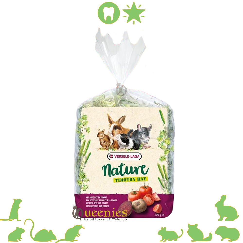 Versele Laga Nature Timothy Hay Ruwvoer Biet Tomaat 500 g direct bestellen in onze webshop! Timothy-hooi verrijkt met biet & tomaat Het Timothy-hooi van Versele-Laga nature is een heerlijk geurend hooi met een hoog ruwvezelgehalte. Dit hooi is verrijkt met rode biet en tomaat, waardoor het vol vitamine en antioxidanten zit. Het is een essentieel basisvoer voor konijnen, cavia's, chinchilla's en degoes en ook gerbils. Samenstelling Timotheehooi (96%), rode biet (2%), tomaten (2%) Bestanddelen Eiwit 5,5%, vetgehalte 1,6%, ruwe celstof 34,5%, ruwe as 5,4%