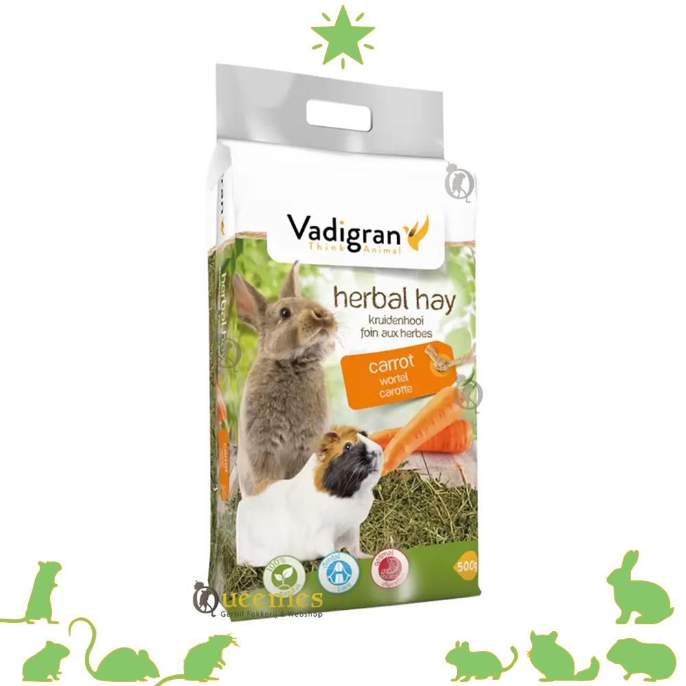 Vadibed kruidenhooi is een natuurlijke hooisoort met toegevoegde kruiden die vele knaagdieren en konijnen heerlijk vinden. Een goede vervanger voor de Beaphar kruidenhooi. Hooi is een onmisbaar product en het belangrijkste onderdeel van het rantsoen voor Gerbils, konijnen en knaagdieren. Het bestaat bijna in zijn geheel uit vezels die ervoor zorgen dat de darmen van uw Gerbil in beweging blijven en dat er natuurlijke gebitsslijttage plaats vindt. Verkrijgbaar met rozenbottel, kruiden of wortel.