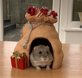 Cupid & Comet Hamsterhuis Kerstzak 12 x 12 x 13 cm Het Cupid & Comet Hamsterhuis Kerstzak 12 x 12 x 13 cm is een kunststof hamsterhuis in de vorm van de cadeauzak van de kerstman, voor hamsters, muizen en gerbils. Zo breng je ook wat kerstsfeer in de kooi van jouw huisdier! Dit leuke huis is gevormd als cadeauzak van de kerstman, gevuld met cadeautjes en zuurstokken. Het huisje heeft aan de voorzijde een ruime opening zodat jouw dier zonder problemen naar binnen en naar buiten kan. Door de dichte structuur kan jouw dier het huisje desgewenst ook vulling met bedding of nestmateriaal. - Huisje voor kleine knaagdieren in kerstsfeer - Gevormd als cadeauzak van de kerstman - Voor hamsters, muizen en gerbils - Met één ingang Afmetingen: 12 x 12 x 13 cm