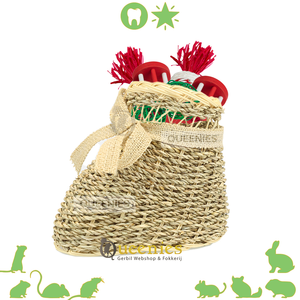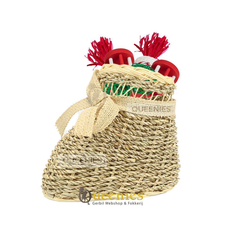 Bekijk deze gekke Kerstmanschoen. Het is niet zomaar een schoen... Het is dé hangplek voor Knaagdieren zoals Gerbils, Dwerghamster, Muis of andere Knaagdieren. Dit coole knaag-speelgoed is gemaakt van zeegras, rotan en een toffe strik van jute. Dus volkomen veilig voor huisdieren om te knagen en te spelen. Ook leuk om te doen is om de schoen te vullen met hooi en ophangen in het Gerbil Terrarium.
