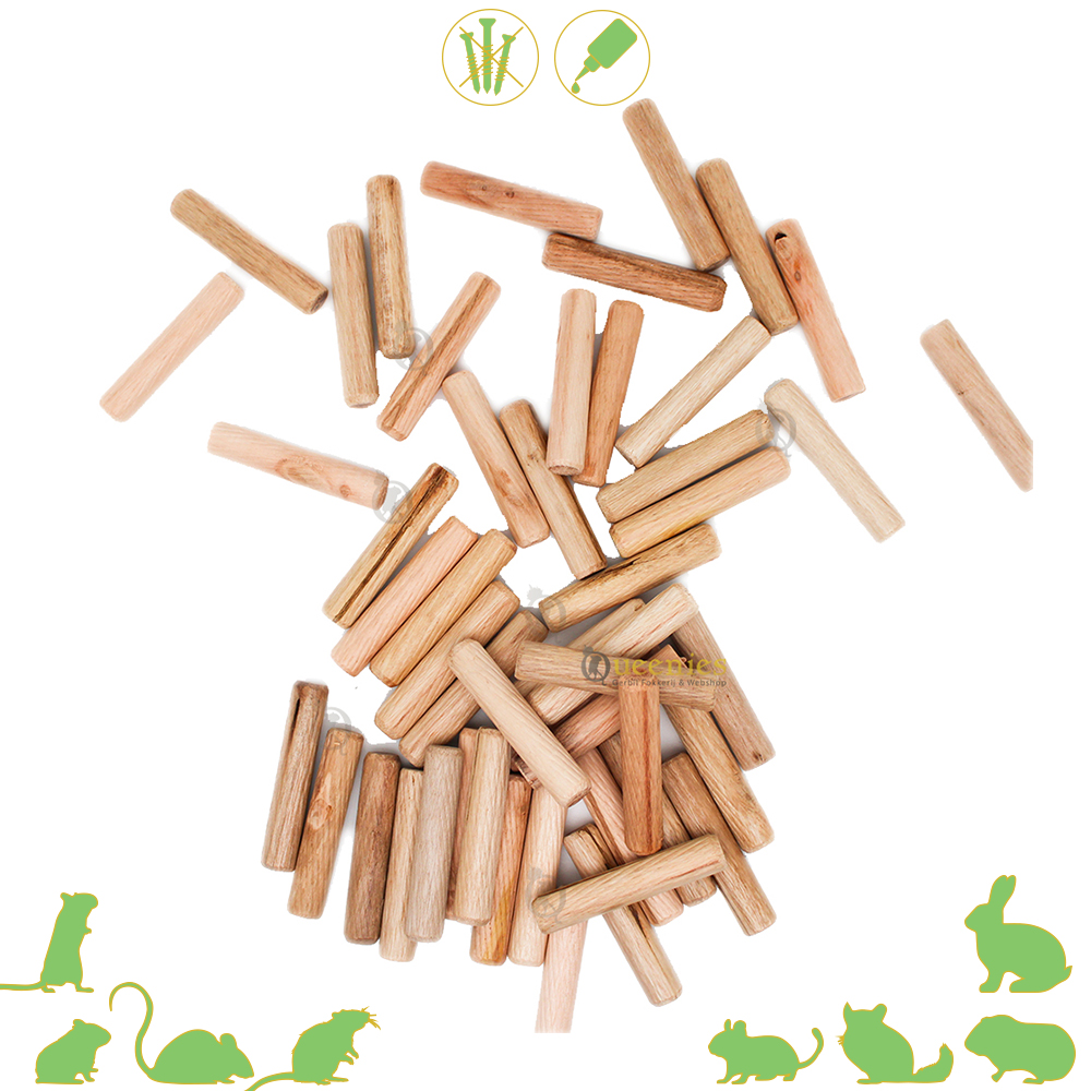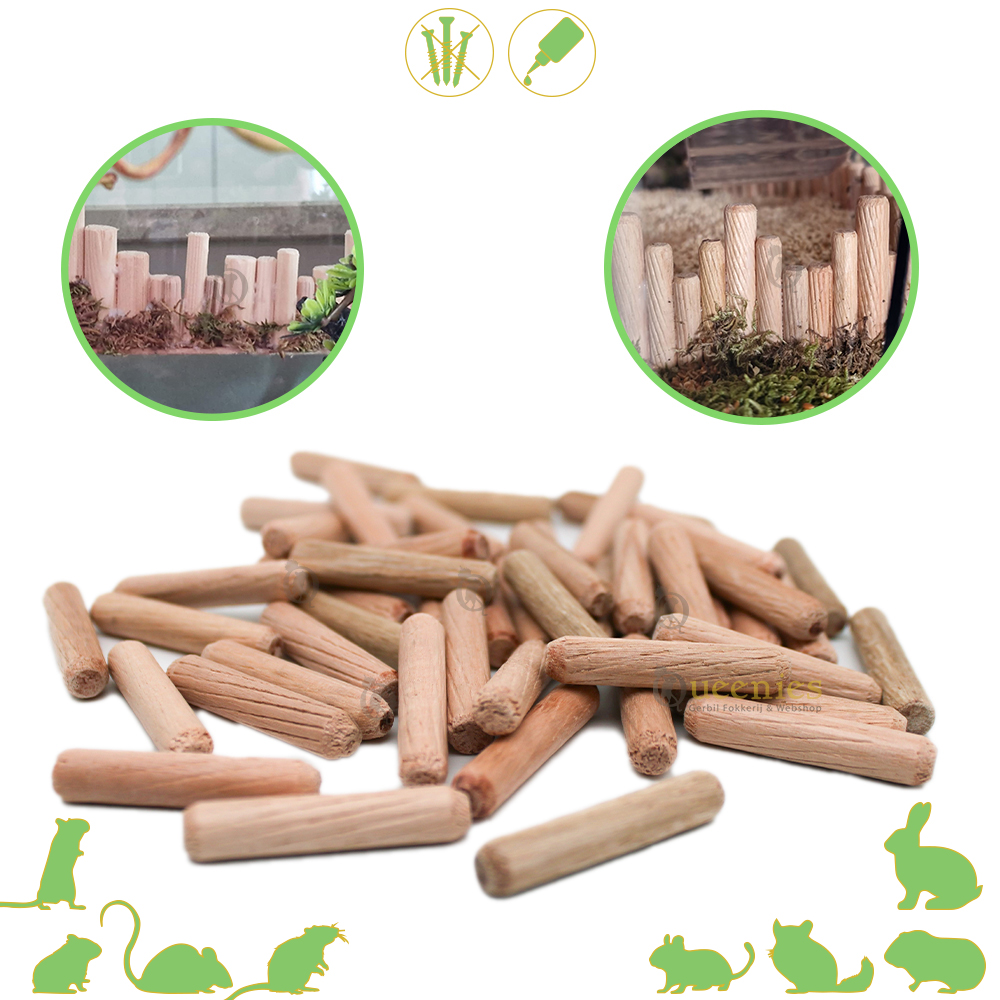 Deuvels mogen nooit onbreken wanneer je creatief bezig gaat zijn met DIY projecten voor Knaagdieren. Met Deuvels maak je eenvoudig randen door ze op het hout te lijmen met onze Knaagdier vriendelijke Houtlijm. Wanneer je DIY Hout hebt gekocht, dan horen de Deuvels erbij. Vergeet deze dus niet! De deuvels gaan per zakje van 50 stuks, maar we tellen de deuvels niet. het wordt gewogen bij ons. Er kan dus een klein verschil zitten in het aantal. Maar nooit veel. Combineer verschillende maten om een leuk speels effect te krijgen waardoor het DIY project nog aantrekkelijker oogt. Lijm het om en om op het Hout.