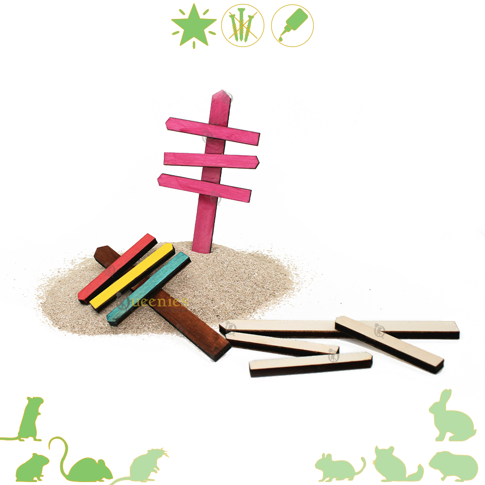 Met de DIY houten Wegwijzer voegt u een nieuw DIY decoratie artikel toe aan het Hamster Terrarium / Gerbilarium. Het product is super makkelijk in elkaar te zetten en kan precies gemaakt worden zoals u wilt. Met moet het bovenste houtje schuin en de rest recht? Alles kan! Dat is het grote voordeel van DIY producten. Met knaagdiervriendelijke Acrylverf kan de houten Wegwijzer geverfd worden in de kleuren die u wilt, niets is te gek. Op de tweede product foto is te zien hoe de Wegwijzer wordt gebruikt in een Tropical Beach Hamsterscape. Dat is natuurlijk niet het enige soort Hamsterscape waar de Wegwijzer in past. De Wegwijzer heeft een tijdloze look, en omdat het een DIY product is kan het gemaakt worden zodat het past in elke soort Hamsterscape.