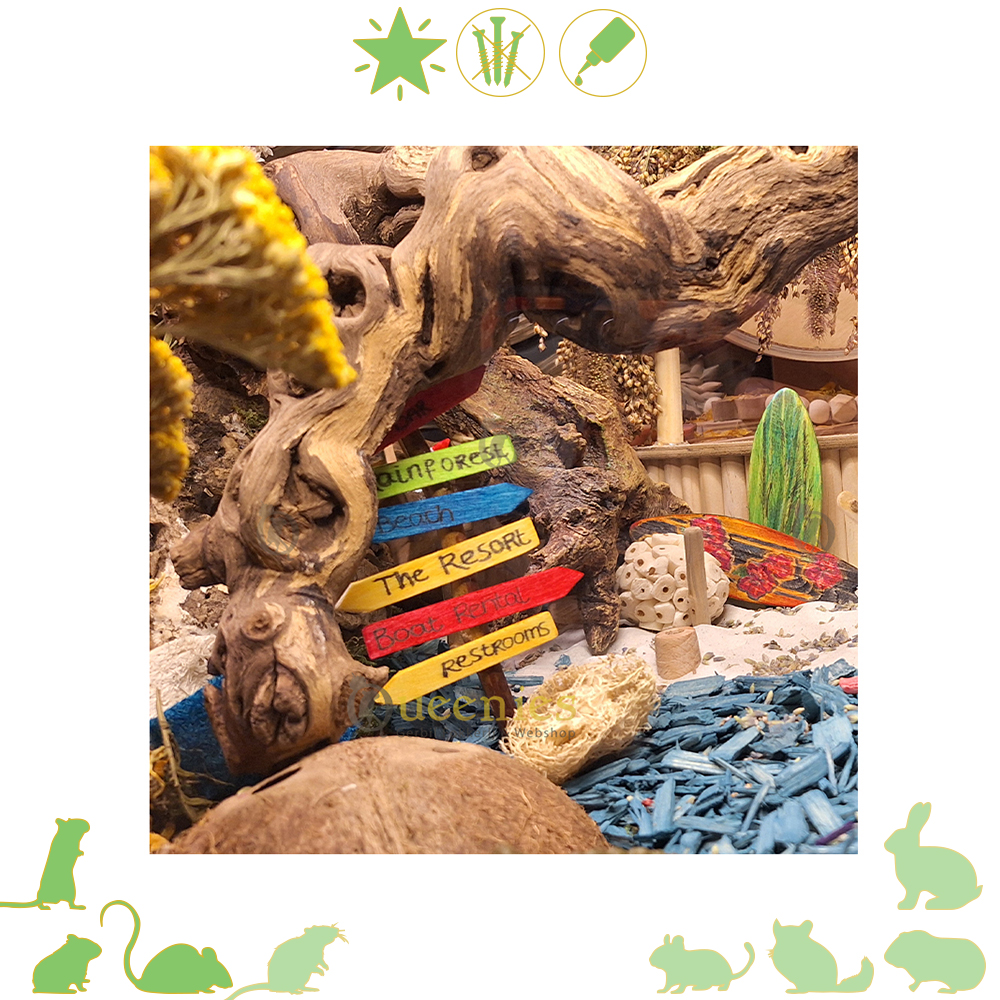 Zoals te zien is op de foto’s hierboven en hieronder, kan de Wegwijzer op verschillende manieren worden gebruikt. Op de foto’s boven is de Wegwijzer verwerkt in een kleurrijke Hamsterscape, terwijl hij op de foto’s onder in een zandbak is toegepast. Gecombineerd met Color Wood, zand of andere decoratieve producten helpt de Wegwijzer bij het creëren van een prachtig mini-landschap. Dit houten DIY-bordje past eigenlijk in elke Hamsterscape, of het nu gebruikt wordt in een zandschaal of puur als decoratie. Beide toepassingen zijn even leuk!