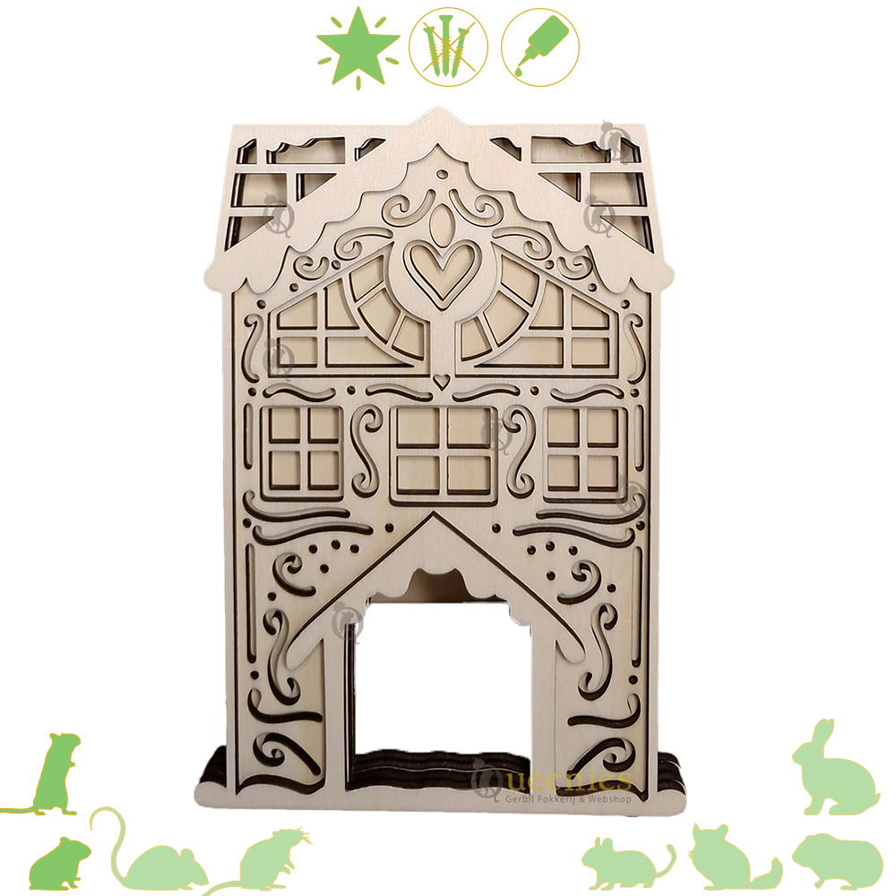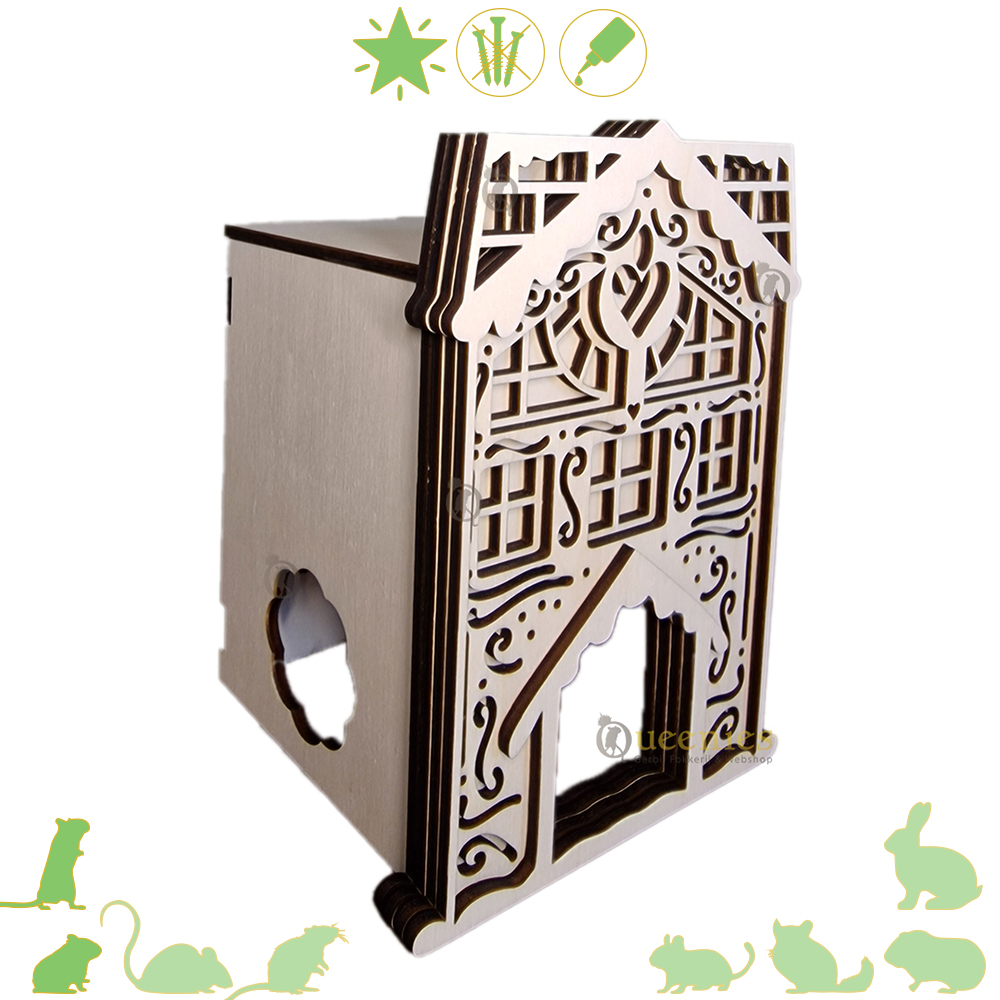 Maak het Terrarium helemaal klaar voor kerst met dit DIY Kersthuis decoratie voor Knaagdieren. De onderdelen passen precies in elkaar zonder scherpe randen, en de stevige constructie zorgt ervoor dat het Kersthuis stevig blijft staan, zelfs als je Knaagdier erin kruipt of ermee speelt. Het bouwpakket is eenvoudig in elkaar te zetten, en je kunt het huisje versieren met diervriendelijke verf om het helemaal aan te passen aan jouw feestthema.