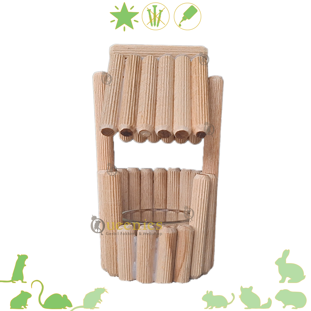 Onze DIY Wensputje geleverd met de benodigde deuvels en het drinkbakje. Je hoeft het enkel nog in elkaar te lijmen met Houtlijm wat je optioneel erbij kunt bestellen als je dit niet in huis hebt. Met dit zelfbouw Hamster DIY projectje creeer je een unieke Hamsterscape look en een leuk project om met de kids in elkaar te zetten wanneer het buiten regent of stormt.