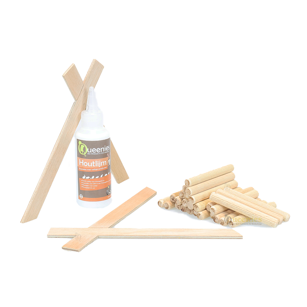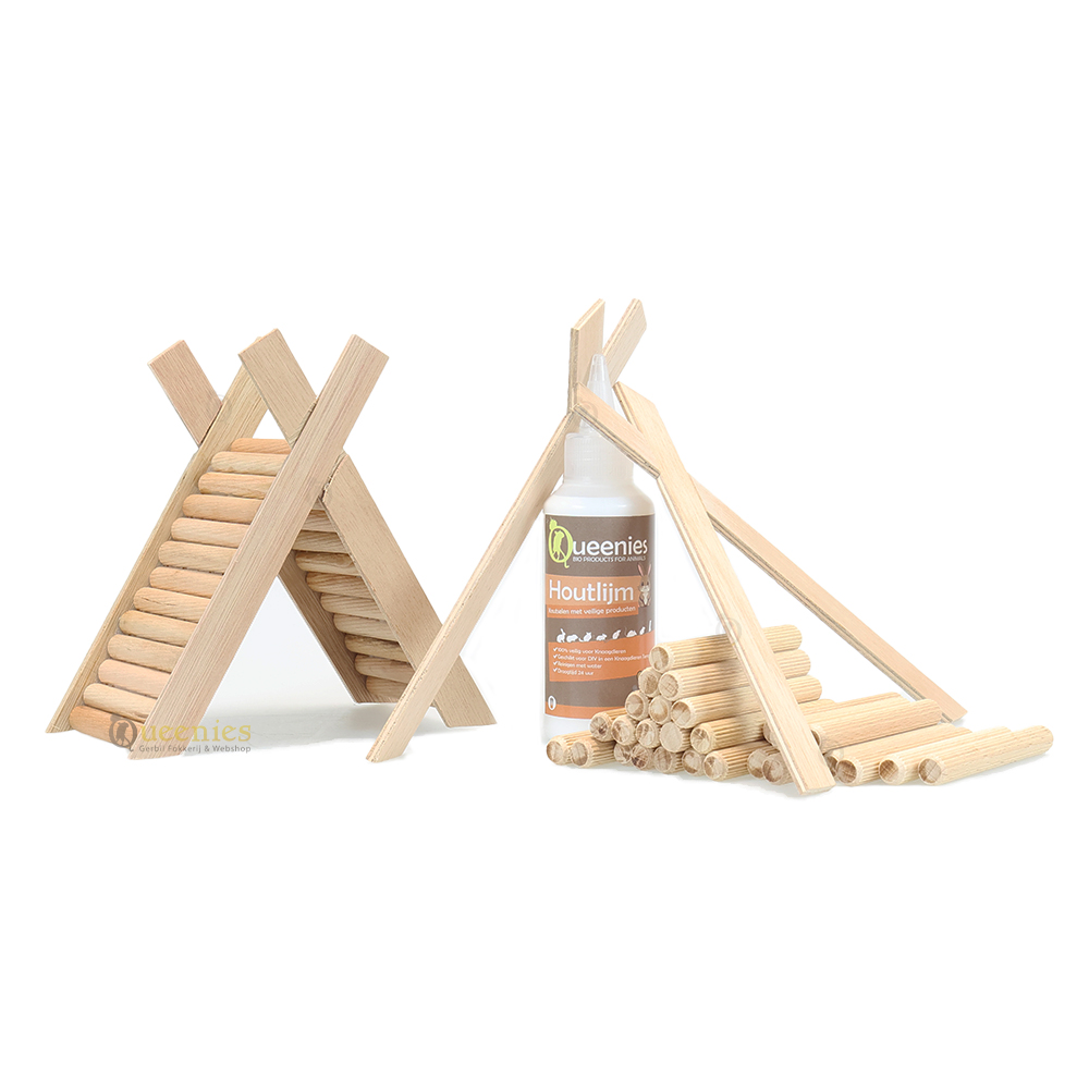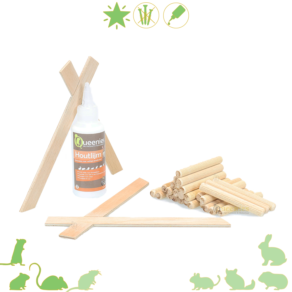 Wij bieden onze DIY Knaagdier artikelen kant en klaar aan! U hoeft niet te zagen en niet te schuren, enkel nog te lijmen! Onze Hamster Tipi Tentjes zijn op maat gezaagd en geschuurd voor een verbluffend resultaat. Het enige wat je hoeft te doen is tijd vrij maken en je knutselvaardigheden gebruiken. Gebruik onze knaagdierveilige Houtlijm en plaats de deuvels netjes tegen elkaar op de rand van de Tipi tent. Nadat je één zijde hebt voltooid, kan ook de andere kant worden gelijmd. Zo eenvoudig is het! Bekijk ook onze instructievideo op YouTube.