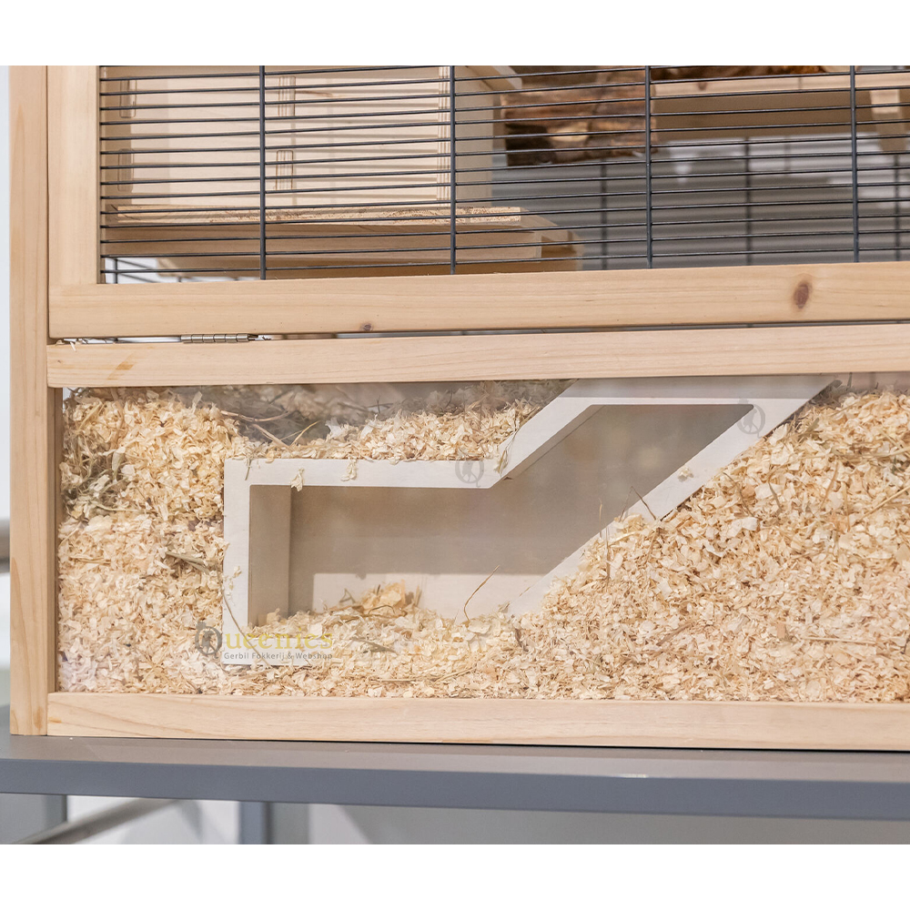 Dankzij de Watchbox van 36 cm kijk je van dichtbij mee met je knaagdieren. Het schuine ontwerp met open voorkant en trapjes maakt het makkelijk voor gerbils, hamsters en muizen om naar binnen en buiten te lopen. Jij kunt rustig zien hoe ze nieuwsgierig hun omgeving verkennen.