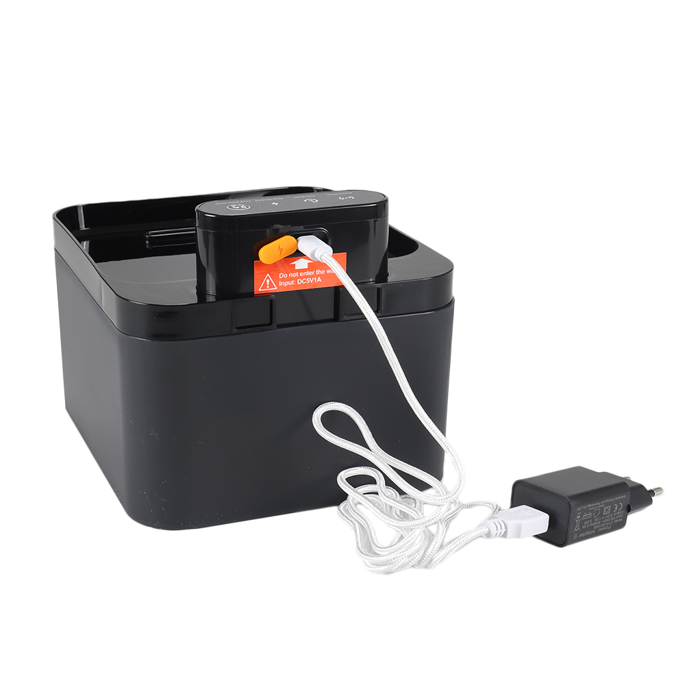 Het systeem is energiezuinig, stil en ontworpen voor langdurig gebruik. Je laadt de accu eenvoudig op met de meegeleverde USB-C kabel waarna de fontein zelfstandig blijft werken.