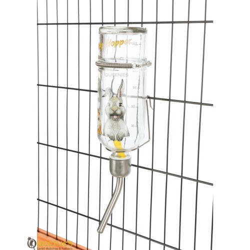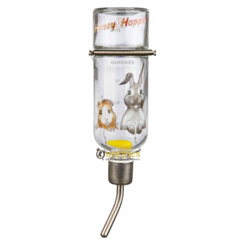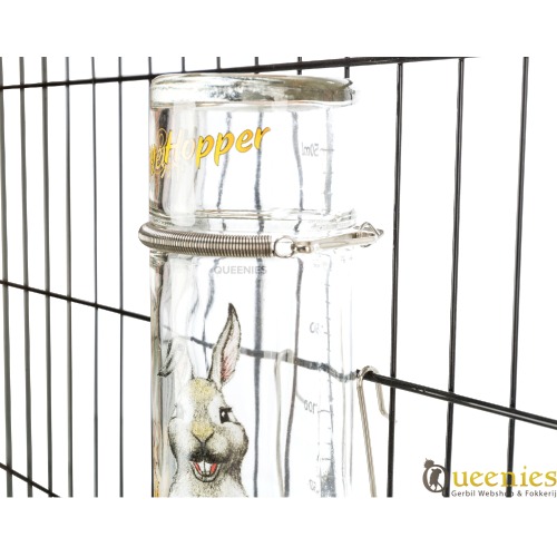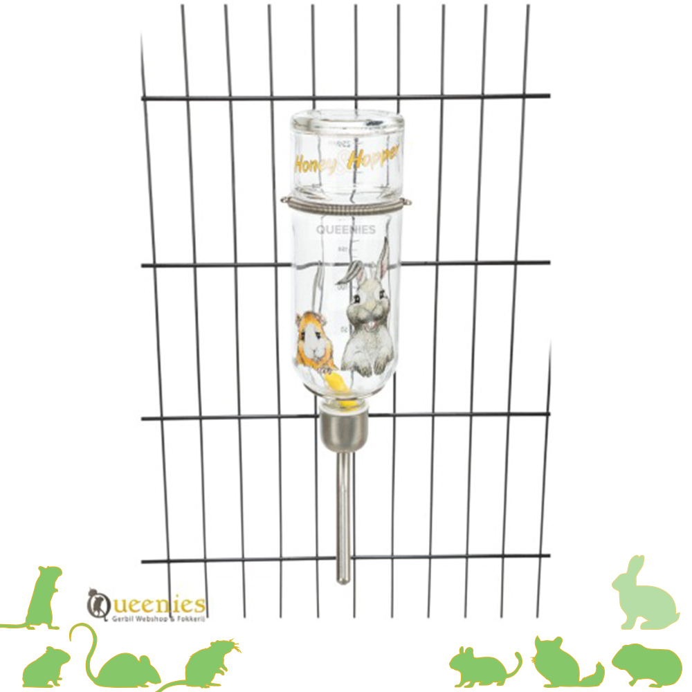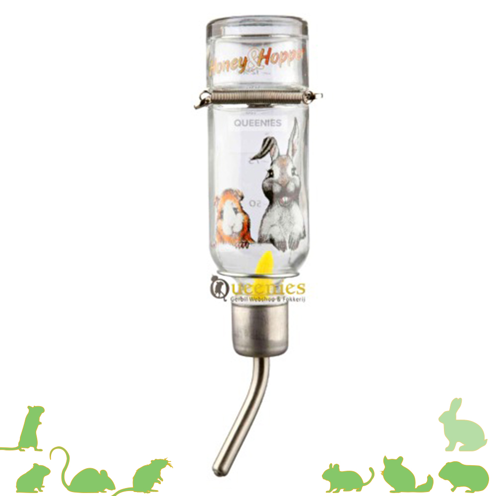 De Trixie Glazen drinkfles van Honey en HOpper heeft een mooi ontwerp en is gemaakt van glas. Deze kan dus niet stuk geknaagd worden door Gerbils of Degoes! Eenvoudig op te hangen aan tralie werk door de meegeleverde spanveer en draadbeugel. Maar Gerbils huisvesten we niet in een traliekooi. Om deze glazen drinkfles te bevestigen in een glazen knaagdieren verblijf vereist wel wat creativiteit.