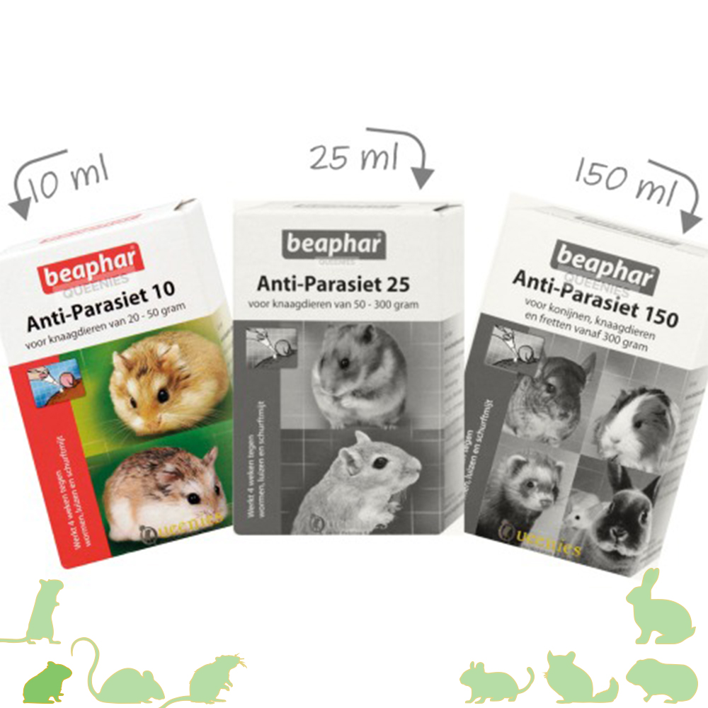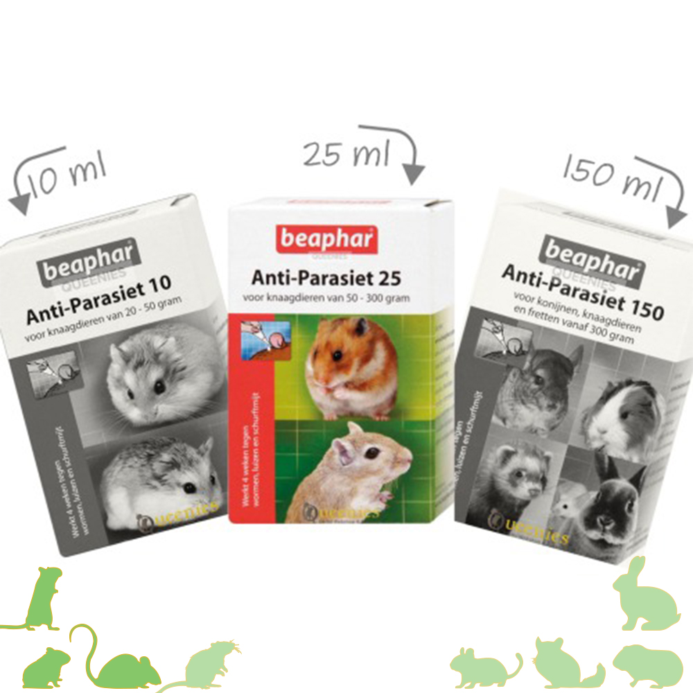 Anti-Parasiet 25 is voor middel grote knaagdieren die een gewicht hebben tussen de 50-300 gram. Dit zijn dieren als Gerbils, Goudhamster of Syrische Hamster.