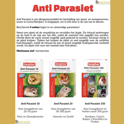 Anti-Parasiet 150 is voor grote knaagdieren die een gewicht hebben vanaf 300 gram. Dit zijn dieren als Chinchilla's, Degoes, Ratten, Cavia's, Konijnen en Fretten.