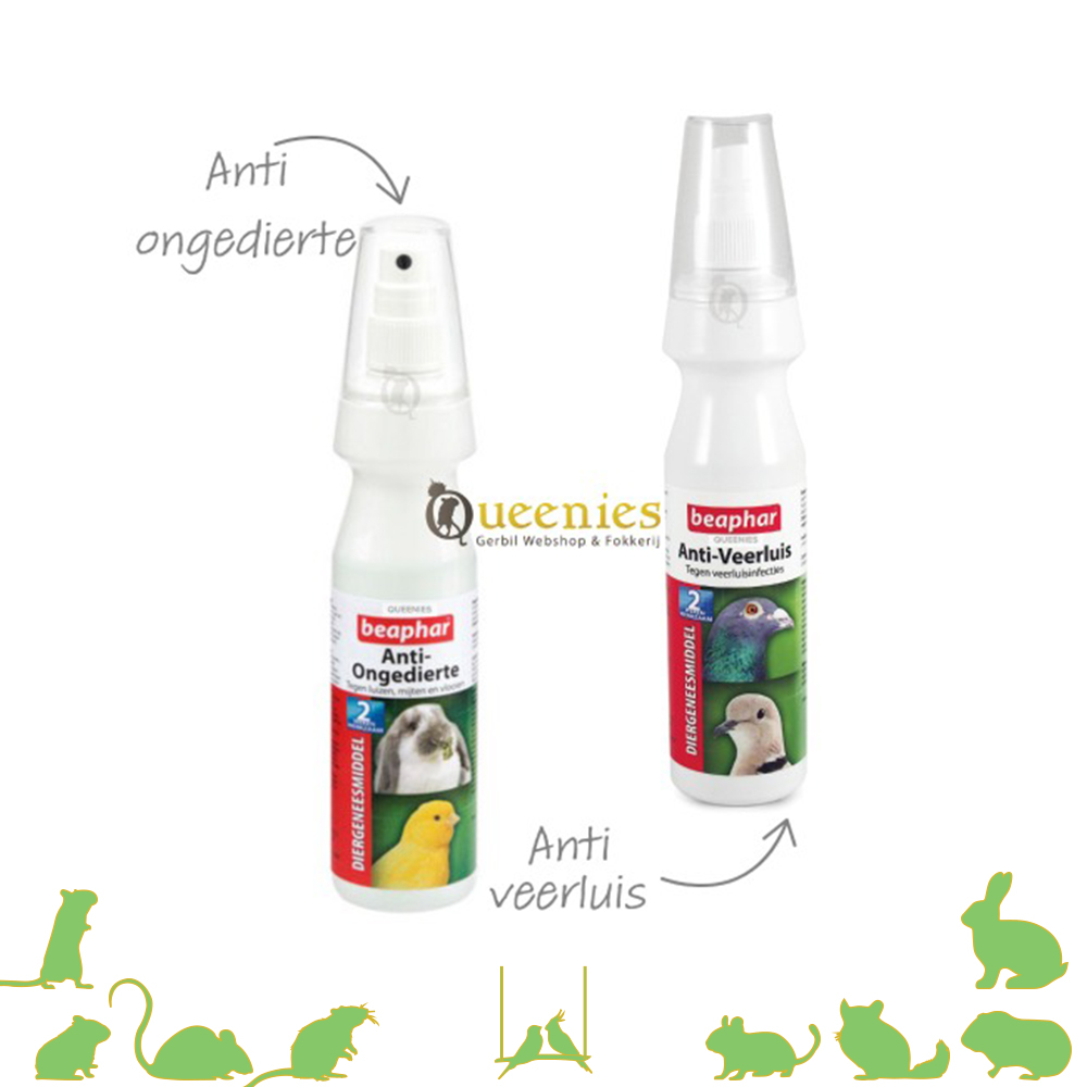 Zowel de Beaphar Anti-Veerluis als de Beaphar Anti-ongedierte spray is inzetbaar bij een ( bloed ) luis infectie mijten en of vlooien. Deze producten kunnen op de huid van de Gerbils of andere Knaagdieren en of Vogels gespoten worden als zij besmet zijn met luizen, mijten en of vlooien. Dè oplossing voor knaagdieren ter bestrijding van ongedierte (luizen, mijten en vlooien)! Er wordt gezegd dat de spray weken werkzaam is. Bij een infectie 1x per week kort sprayen, daarna preventief inzetten 1x in de maand. Goed te combineren met de Hemexcide bij een bloedluis infectie. Of te combineren met anti parasiet voor algehele ontsmetting bij infectie / voorkoming hiervan. De Hemexide is ook zeer effectief in het preventief bestrijden van vlooien en mijten in het Gerbilarium of de speeltjes en attributen van uw Knaagdier of Vogel.
