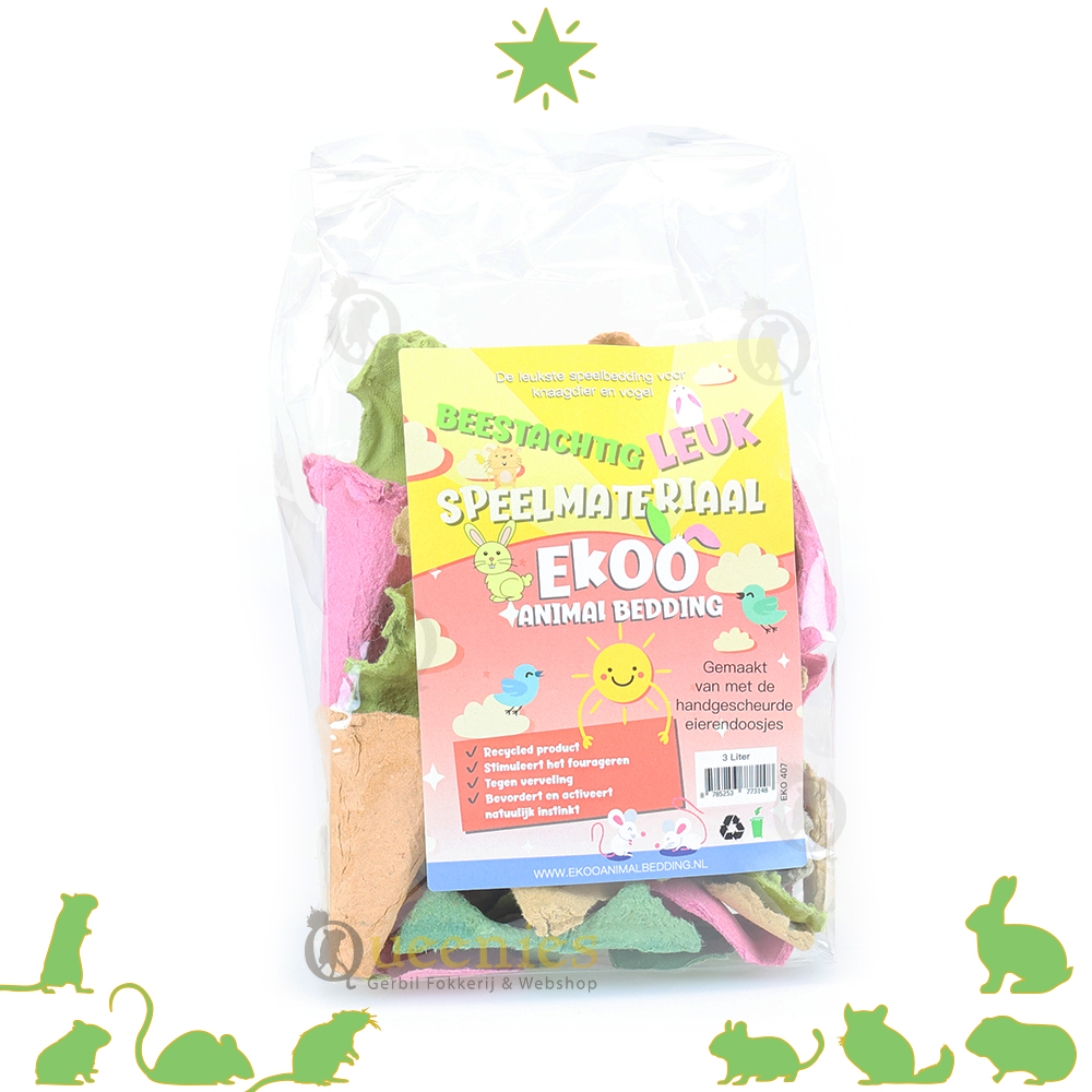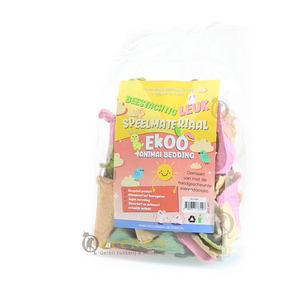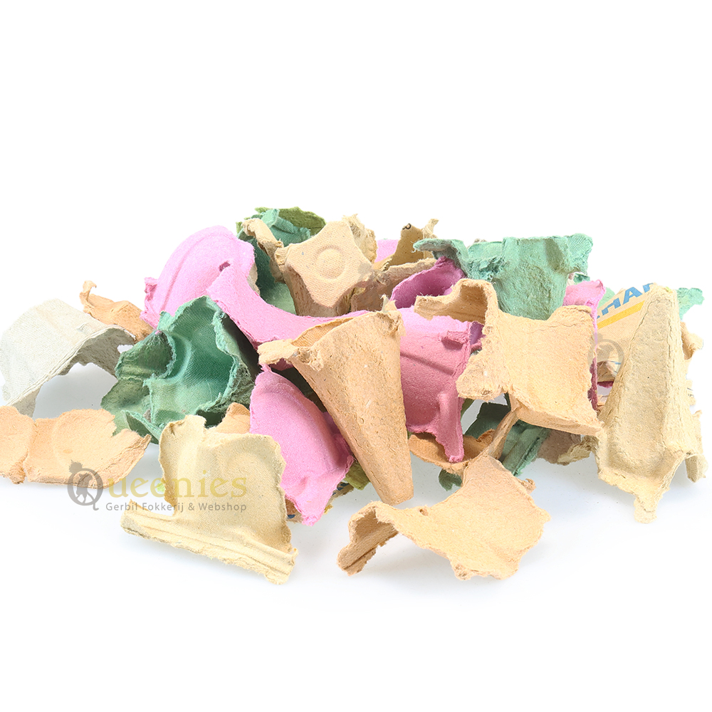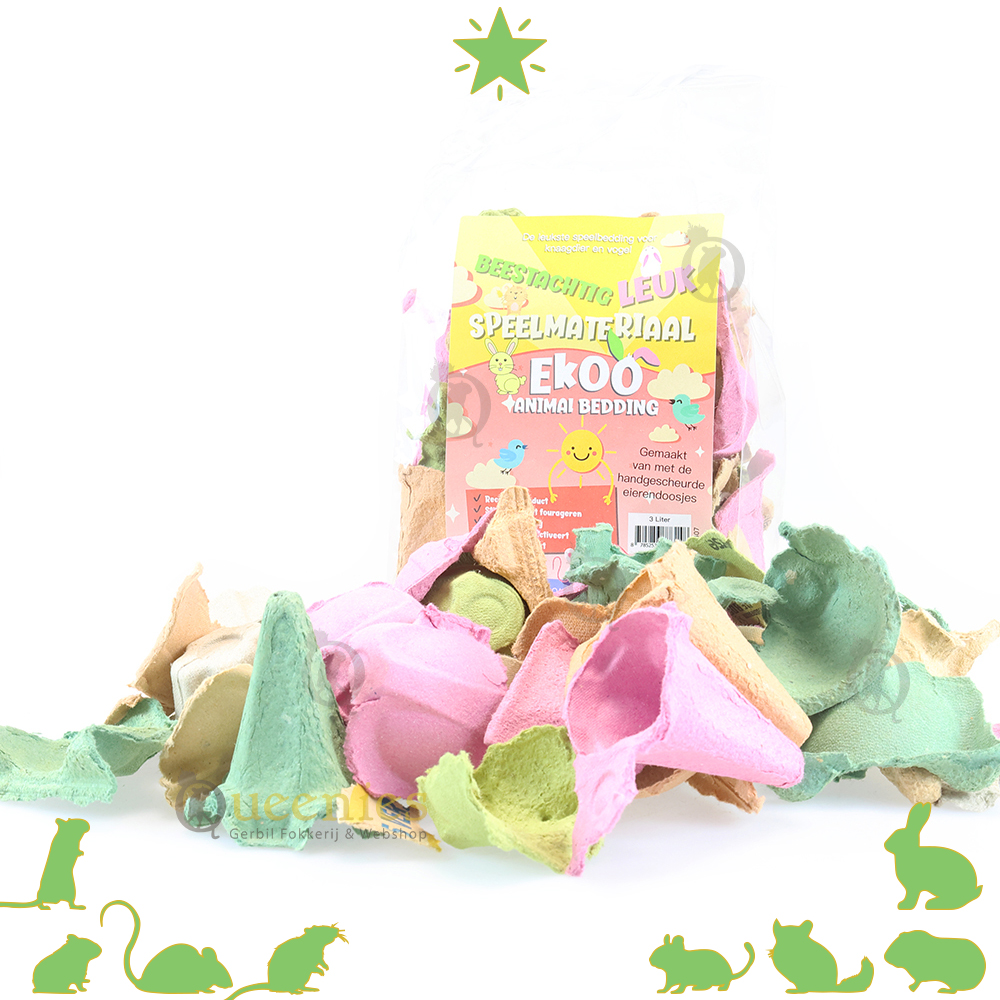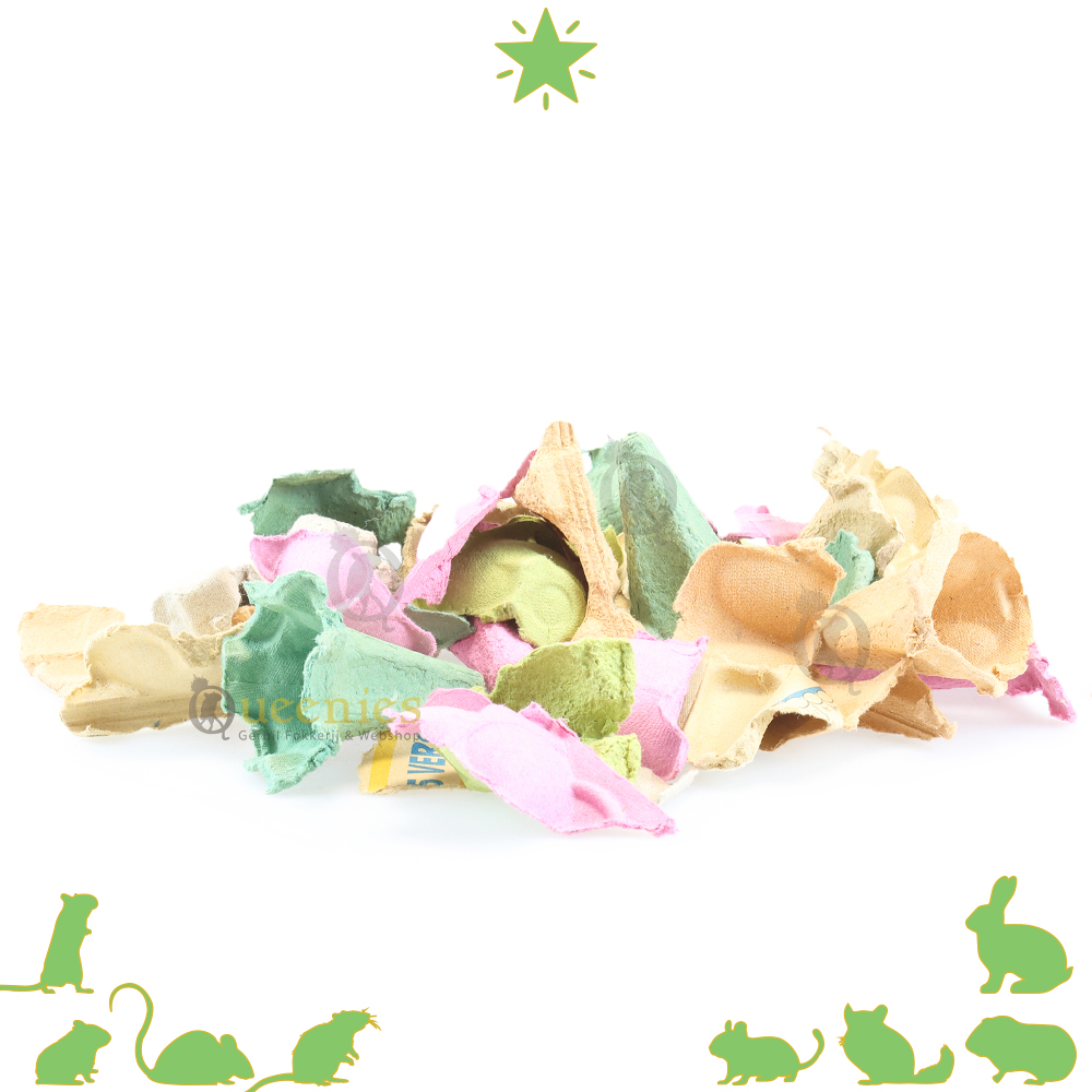 Het product is om een milieuvriendelijke manier gemaakt. Eierdoosjes die anders weggegooid zouden worden zijn nu gebruikt als Speel, Foerageer of Nestmateriaal. De Bodembedekking voelt erg zacht aan en is voor Knaagdieren fijn om overheen te lopen wat het ideale speelgebied creëert. Als Vogels proberen het product kapot te maken kan dit geen kwaad. De stukjes eierendoos zijn makkelijk om te ruimen en zijn niet gevaarlijk voor Vogels of andere dieren. Het product heeft geen schadelijke stoffen, waardoor Vogels en Knaagdieren zonder problemen hieraan kunnen knagen, knabbelen en mee kunnen spelen.