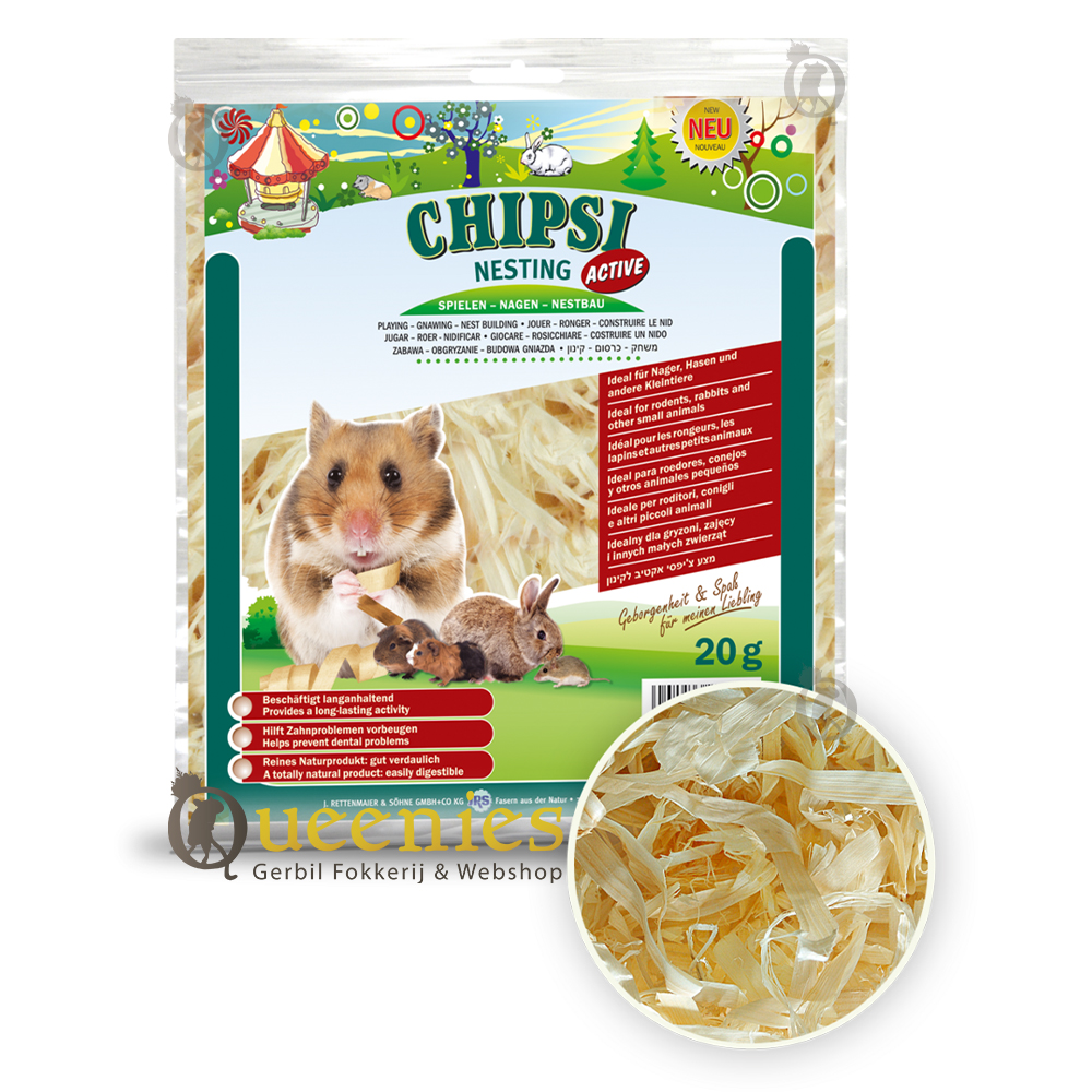 Deze onbewerkte natuurlijke vezels van Chipsi geven uw Gerbils de mogelijkheid om een warm nestje te creeren of om heerlijk mee te spelen en graven graven. Het klein maken van dit netstmateriaal is ook een fijne bezigheid voor Gerbils. Zij kunnen dan lekke knagen aan de grove krullen. Chipsi Nesting bestaat uit vezels van hout welke de ideale structuur hebben om mee te spelen of te nestelen.