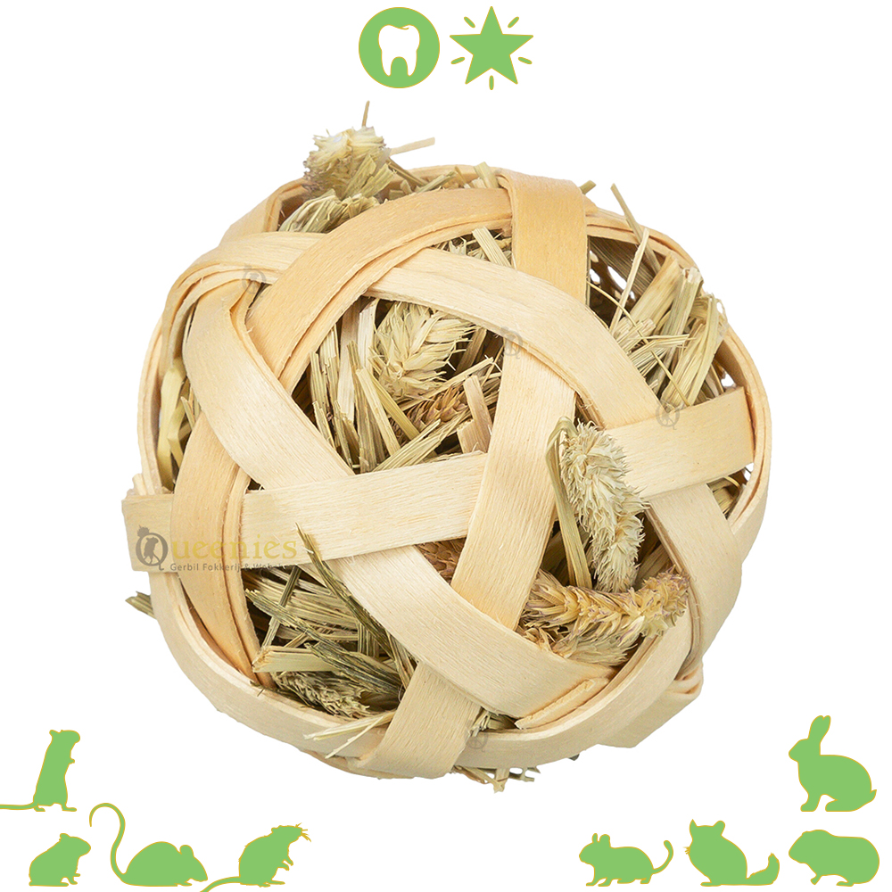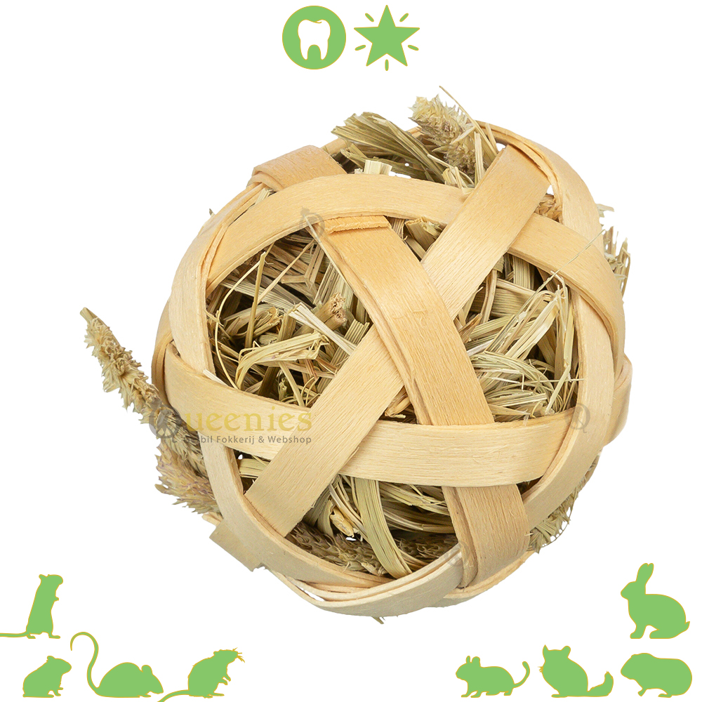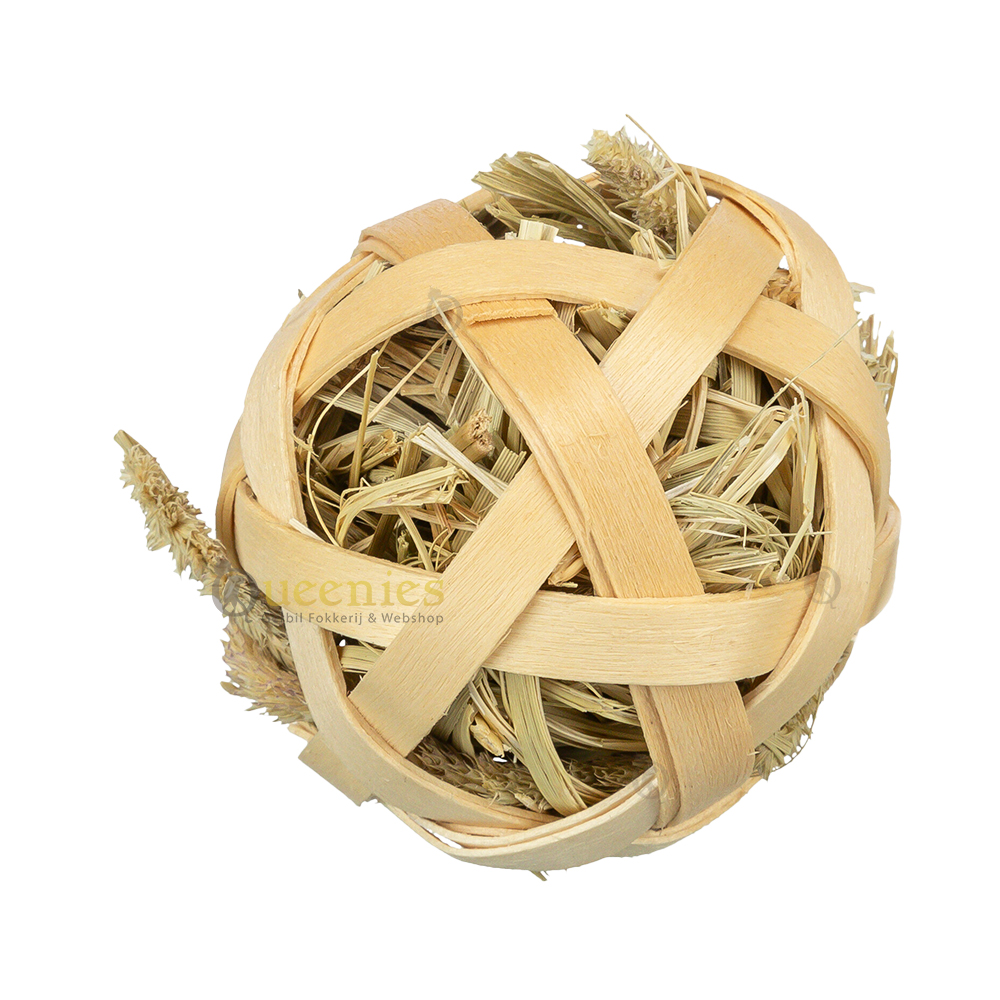 Deze compacte bamboebal is gevuld met geurend hooi. De natuurlijke materialen maken het een perfect item om mee te slepen, in te nestelen of nieuwsgierig aan te knabbelen. Dankzij het lichte gewicht kunnen zelfs jonge dieren ermee aan de haal.