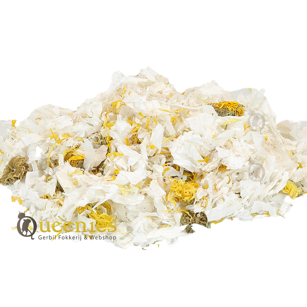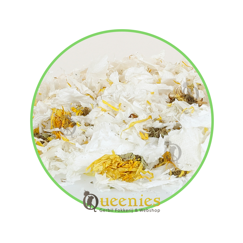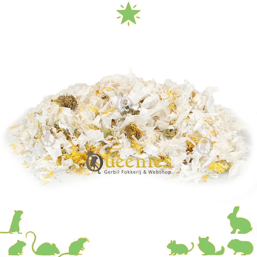 Dit Nestmateriaal is gemaakt van zijdezachte Teabags met als verfijnde toevoeging onze vers gedroogde Goudsbloem die iedere Dwerghamster, Gerbil, Muis, Rat of onze grotere Knagers zoals Konijnen en Cavia's als geweldig zullen ervaren!. De Teabags, ofwel Theezakjes zijn onze absolute favoriet! Of nou ja, onze favoriet? De favoriet van ieder Knaagdier en Vogel.