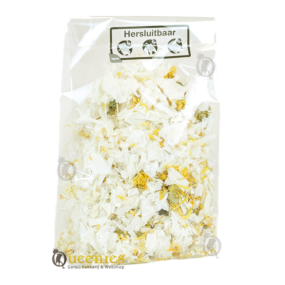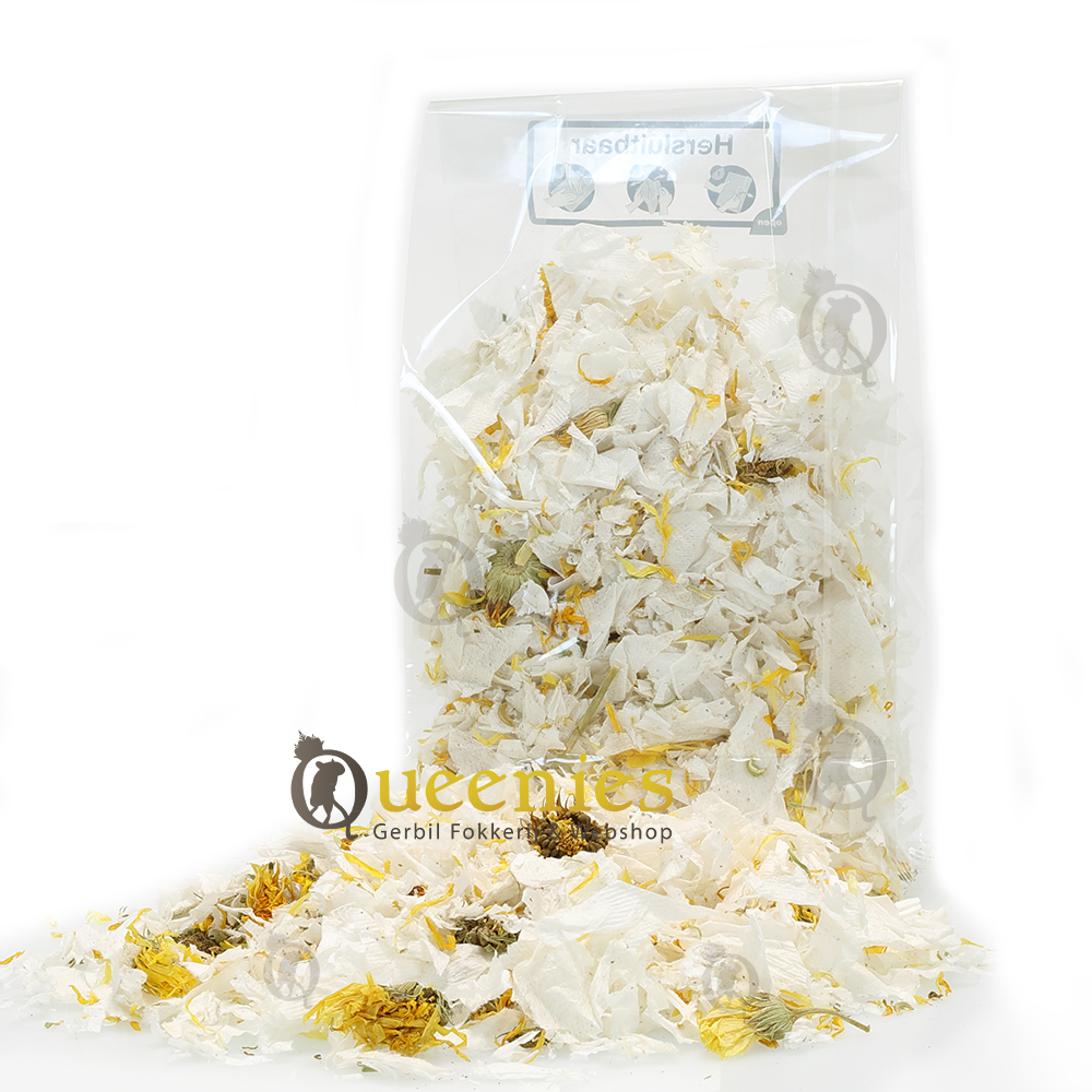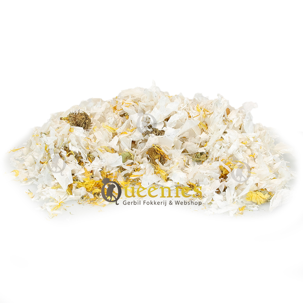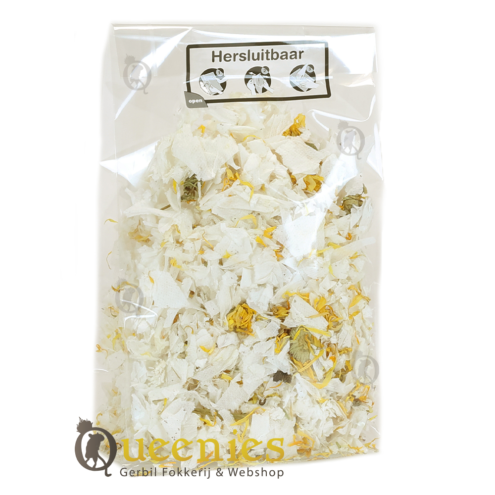 Dit Nestmateriaal is gemaakt van zijdezachte Teabags met als verfijnde toevoeging onze vers gedroogde Goudsbloem die iedere Dwerghamster, Gerbil, Muis, Rat of onze grotere Knagers zoals Konijnen en Cavia's als geweldig zullen ervaren!. De Teabags, ofwel Theezakjes zijn onze absolute favoriet! Of nou ja, onze favoriet? De favoriet van ieder Knaagdier en Vogel.