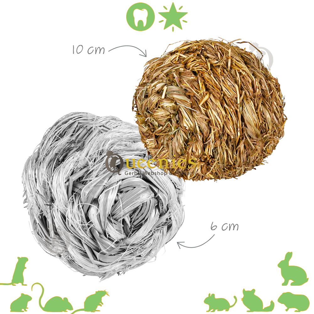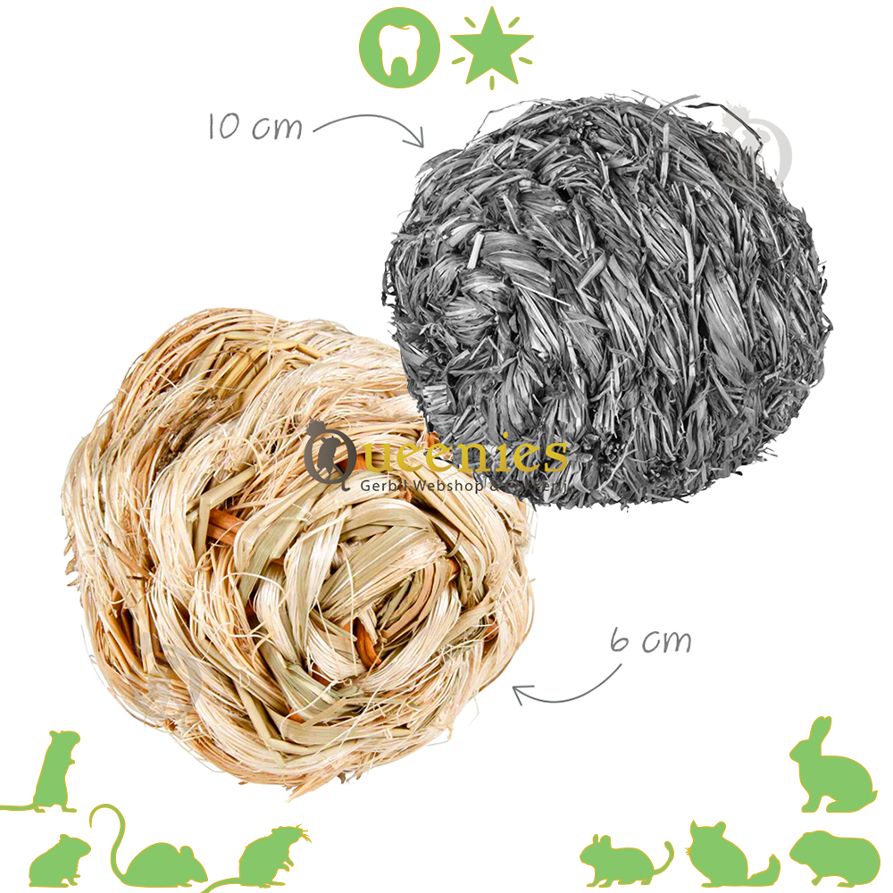 De Grasbal met Belletjes is in twee verschillende maten verkrijgbaar. Zo is er voor elk soort Knaagdier of Konijn een geschikt Grasballetje. Door het belletje wat in de Grasbal zit raken Knaagdieren en Konijnen geïnteresseerd. Gerbils zijn bijvoorbeeld hele nieuwsgierige dieren. Door het geluid van de bel gaan de Gerbils op onderzoek uit waar het geluid vandaan kwam. Op deze manier blijven de Gerbils of andere Knaagdieren alert en oplettend. Dit zorgt er ook voor dat de Gerbils actief en scherp blijven.