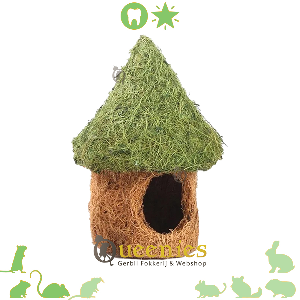 Ze zullen het nestje zoals we gewend zijn van de Gerbils snel aanvallen en kapotmaken, maar daarna kan het perfect gebruikt worden als nestmateriaal. Doordat het van stevig cocosvezel gemaakt is, blijft het 'touw' lang, erg lang goed. Ze gaan het dan zelf weer hersylen naar hun eigen inzien, en met dit materiaal een heerlijk nest te bouwen. Leuk met groen dak.