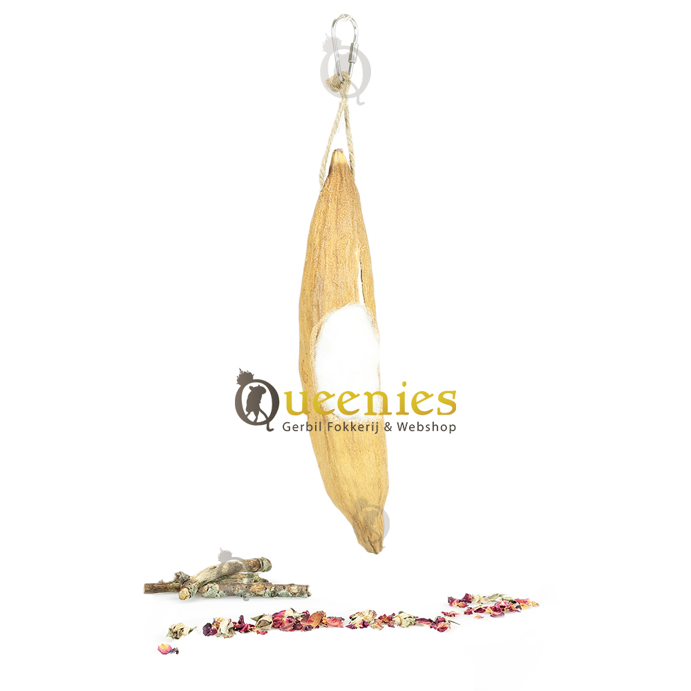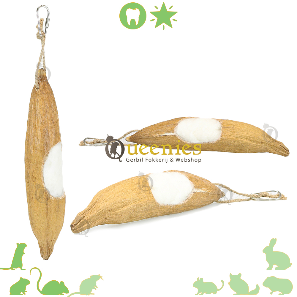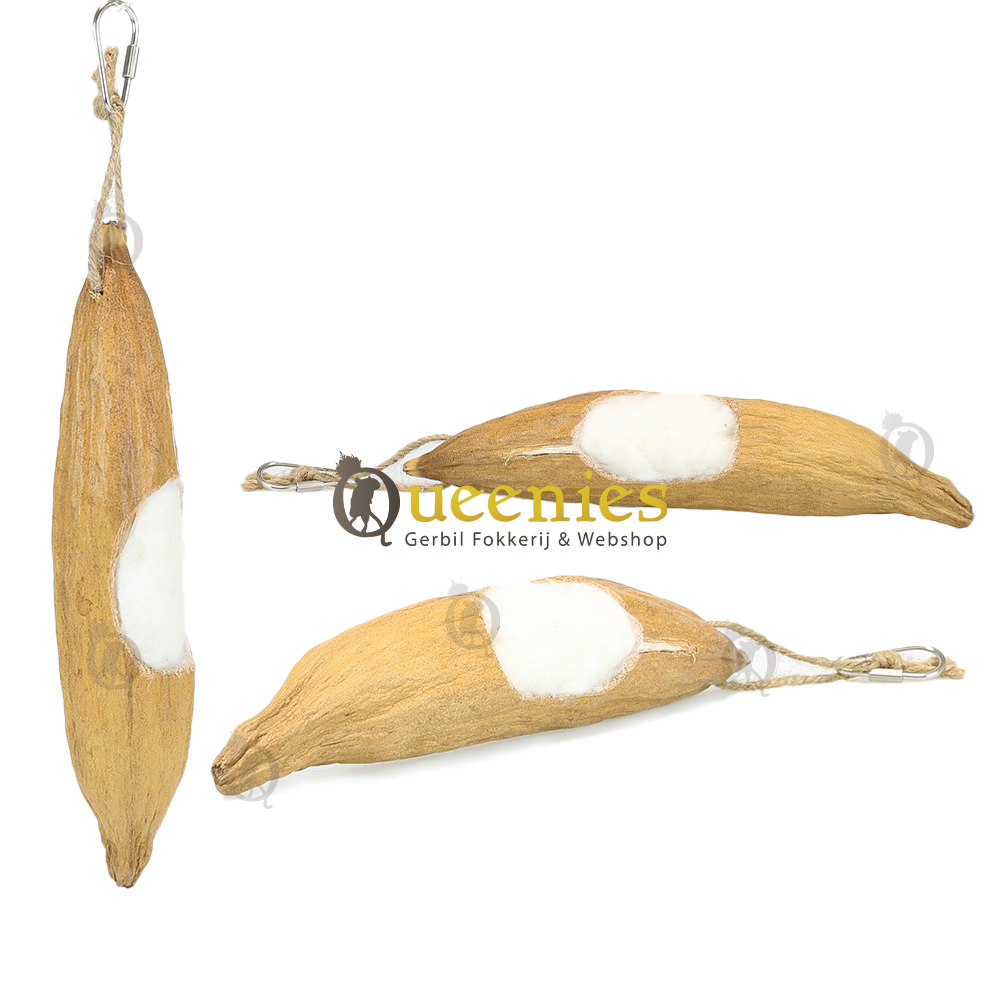 De Hangende Kapoknoot is het nieuwe speelgoed of nestmateriaal voor Kleine Knaagdieren zoals Gerbils, Hamsters en Muizen. De Hangende Kapoknoot heeft een ingang waar Gerbils makkelijk in kunnen klimmen. De binnenkant van de noot is super zacht door het kapok wol wat in de noot zit. Hierdoor kunnen Hamsters of Gerbils een comfortabel nest voor zichzelf maken en hebben ze ook direct een slaaphuisje gevonden waar ze direct kunnen neerstrijken om te rusten.
