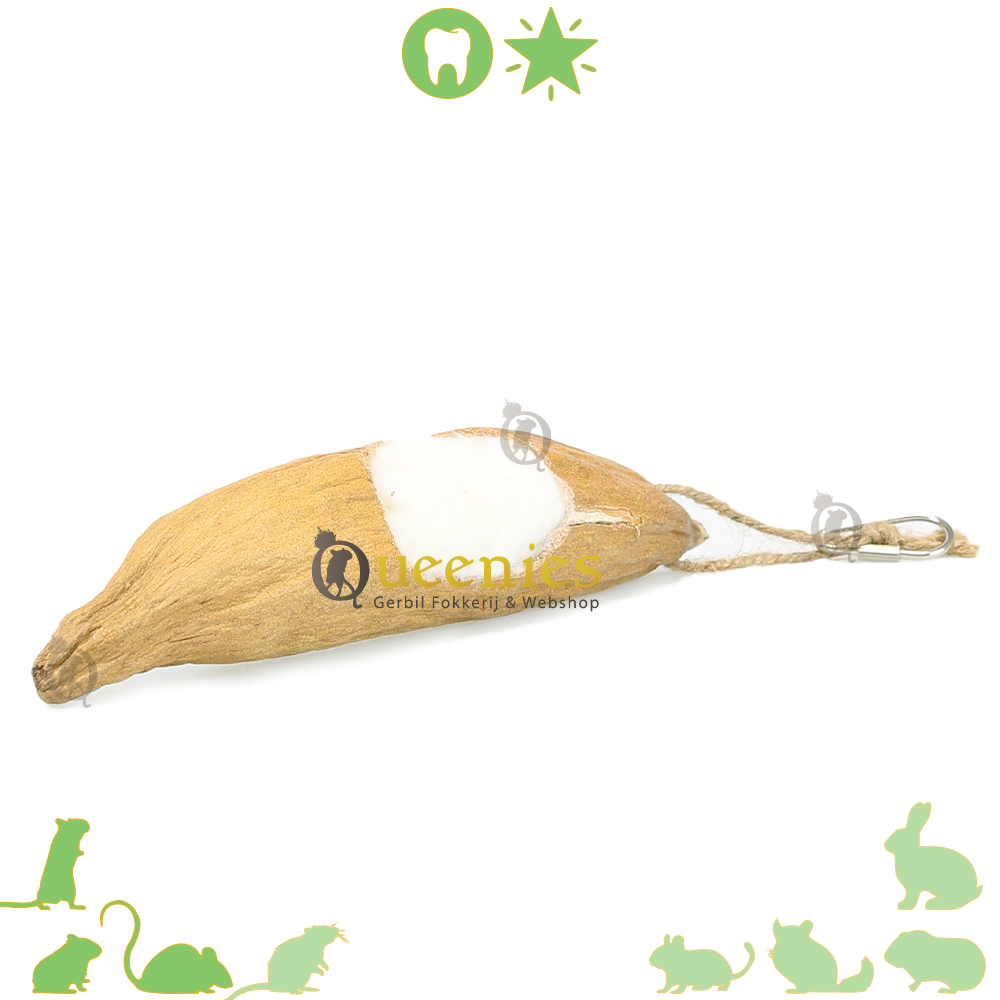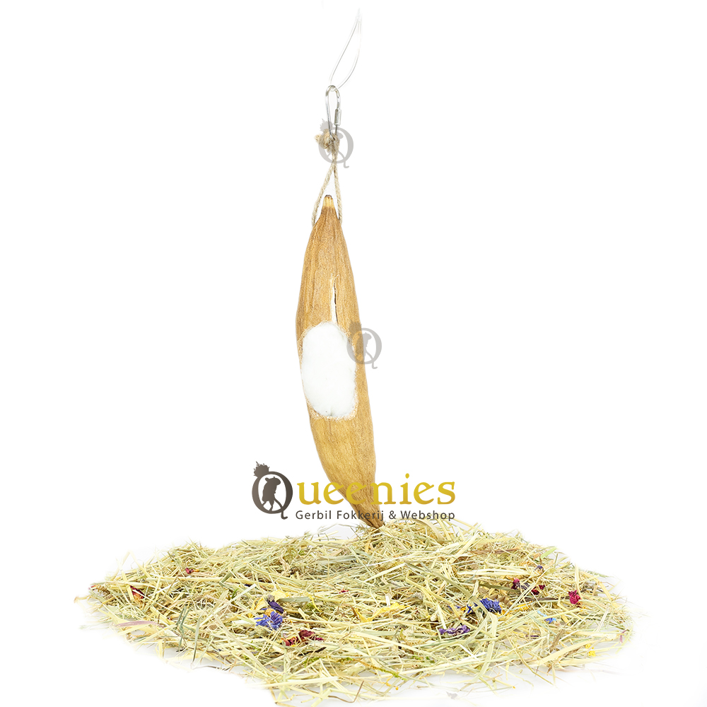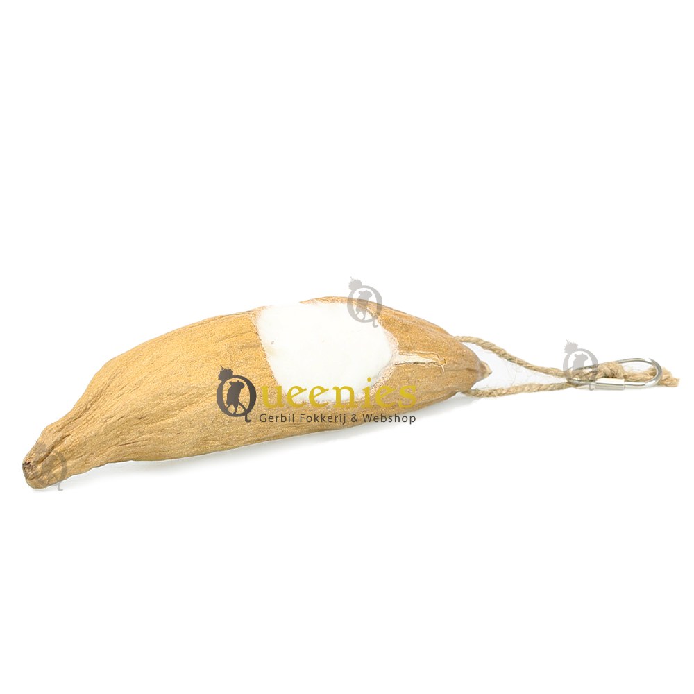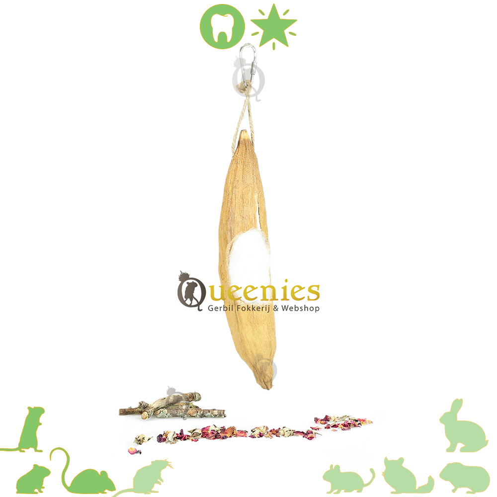 De Hangende Kapoknoot is het nieuwe speelgoed of nestmateriaal voor Kleine Knaagdieren zoals Gerbils, Hamsters en Muizen. De Hangende Kapoknoot heeft een ingang waar Gerbils makkelijk in kunnen klimmen. De binnenkant van de noot is super zacht door het kapok wol wat in de noot zit. Hierdoor kunnen Hamsters of Gerbils een comfortabel nest voor zichzelf maken en hebben ze ook direct een slaaphuisje gevonden waar ze direct kunnen neerstrijken om te rusten.