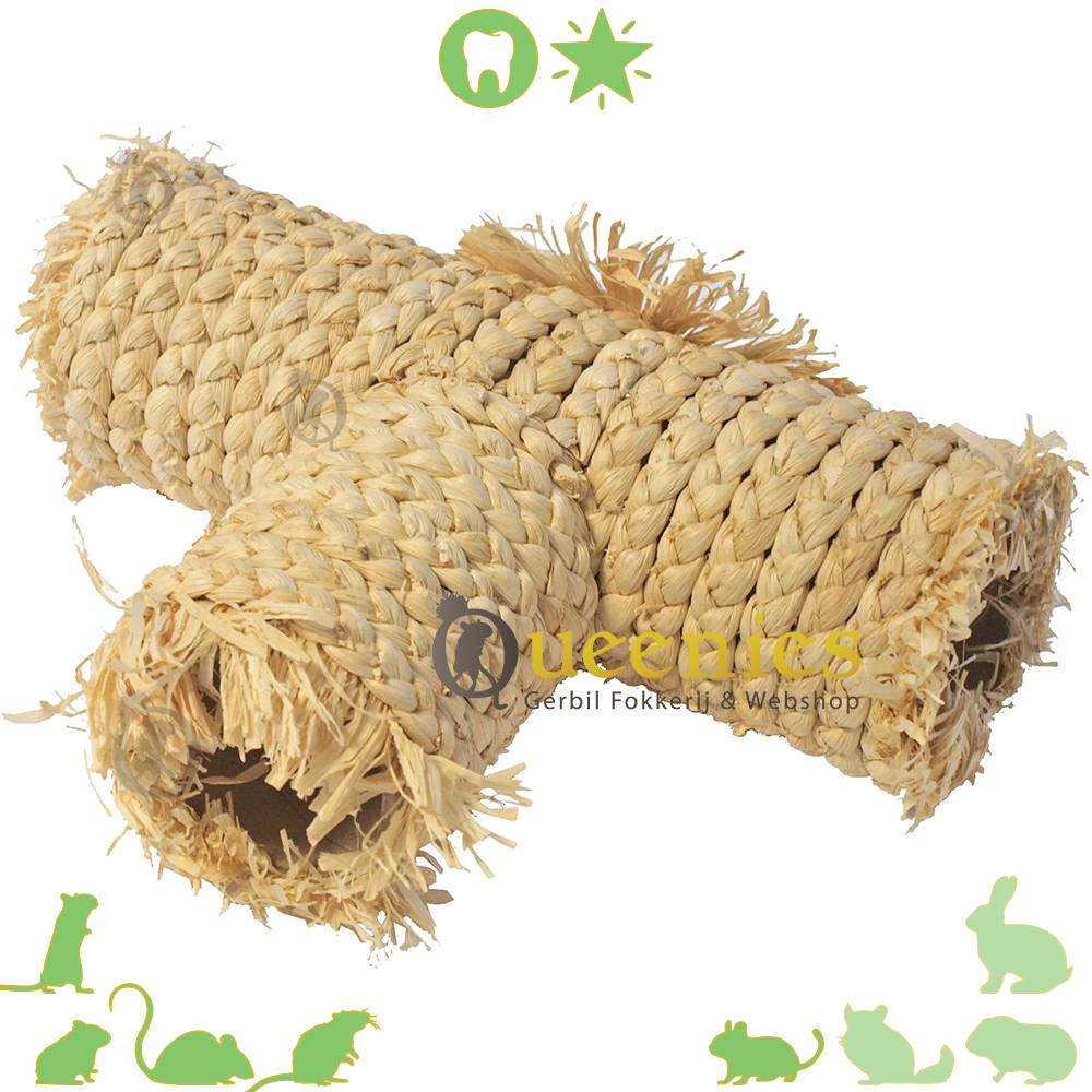 De Knaagtunnel T-model is een leuk speeltje voor knaagdieren waar heerlijk aan geknabbeld mag worden. Dit speeltje zorgt voor afleiding en voorkomt zo verveling. Het is gemaakt van 100% natuurlijk materiaal en is dus onschadelijk! Daarnaast kan de tunnel gebruikt worden als slaap, rust of schuilplek. Het riet zit om hard karton. Dit product zal niet zo snel weggeknaagd worden door gerbils.