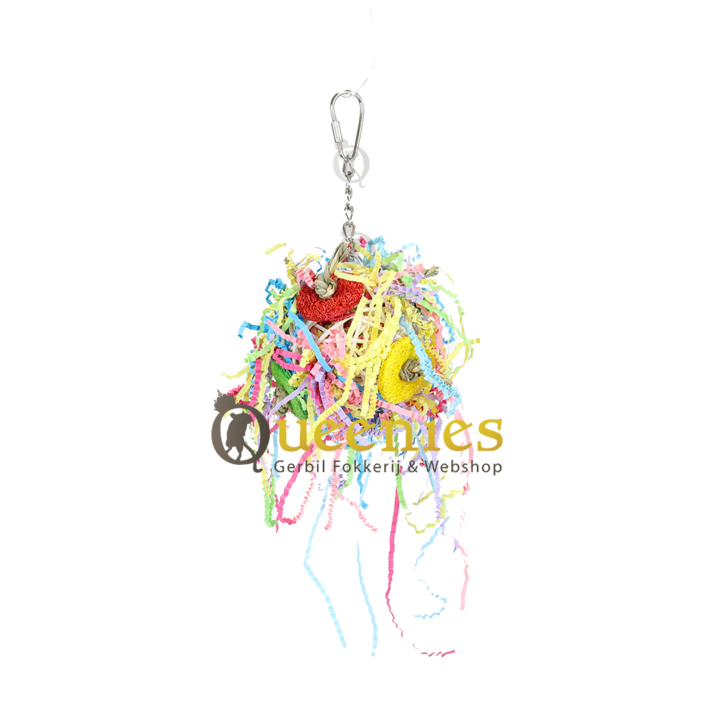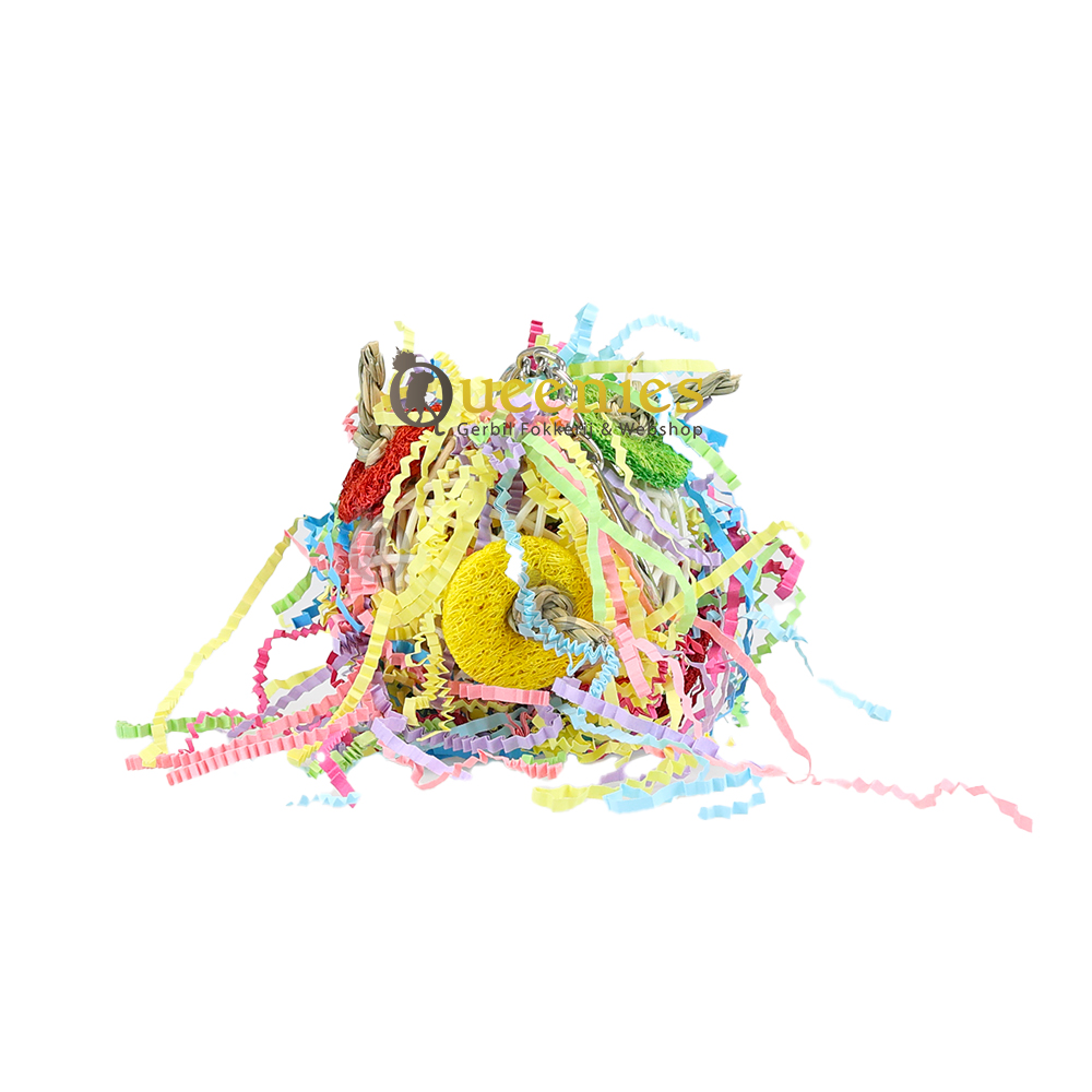 Deze Rotan Speelbal met Sizzle Slierten is geweldig Vogel en Muizen Speelgoed die is gemaakt met Wilg, Loofah en gekleurde Sizzle Slierten. Een aantrekkelijke Speelbal zeker voor Vogels. Vogels zoals Parkieten en Papegaaien houden heel erg van kleur. Fel gekleurde Sizzle Slierten is daarom direct een grote favoriet voor uw Vogel. Maar ook Knaagdieren zoals Gerbils en Muizen vinden deze gekleurde Sizzle Slierten, het Loofah en de Wilgenbal geweldig om mee te spelen. Het geeft uw huisdier optimaal speelplezier waarna het restmateriaal uitstekend gebruikt kan worden als nestermariaal.
