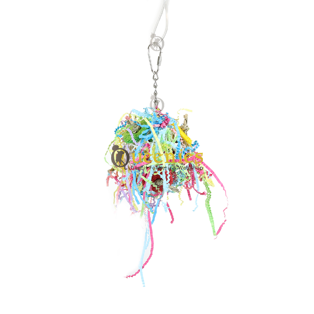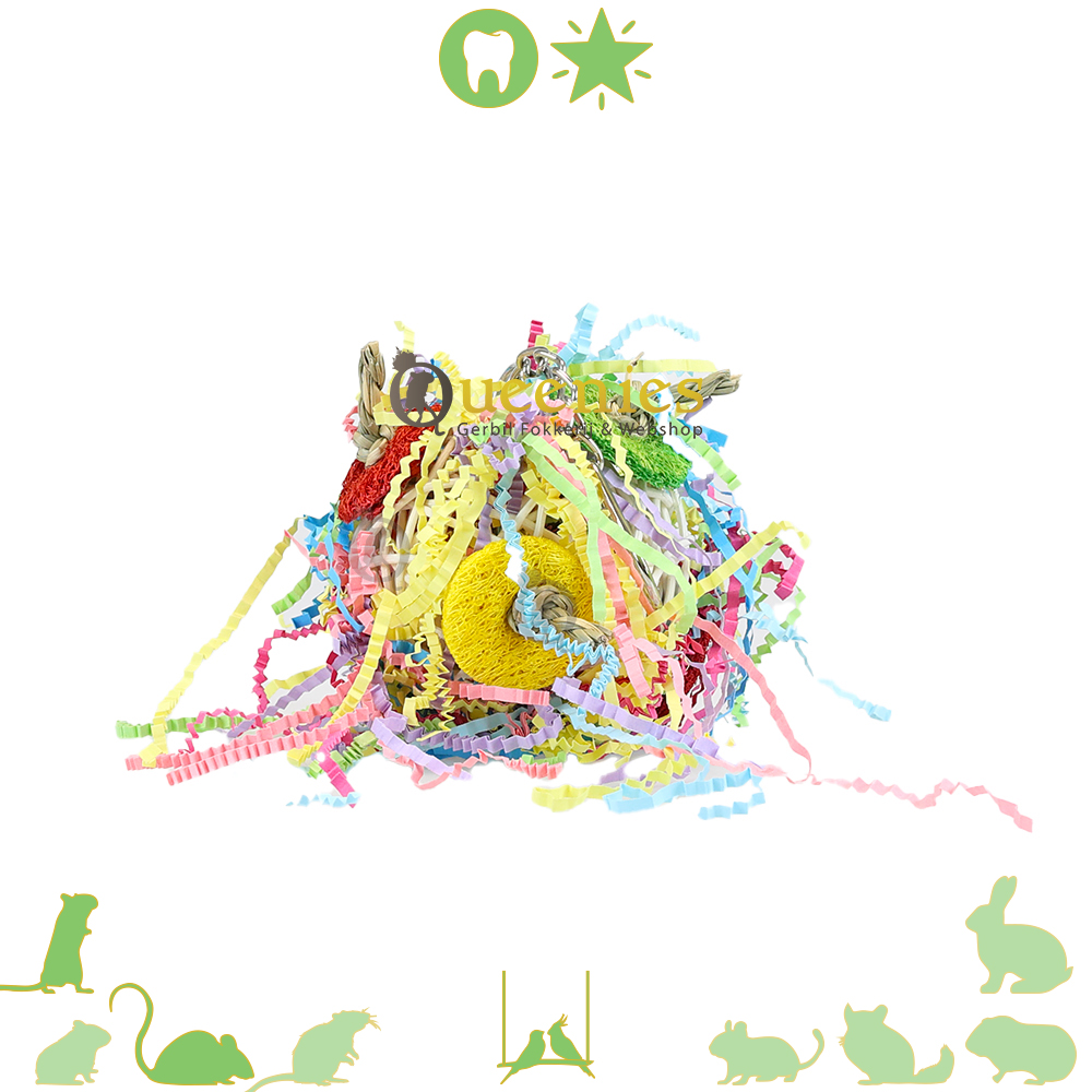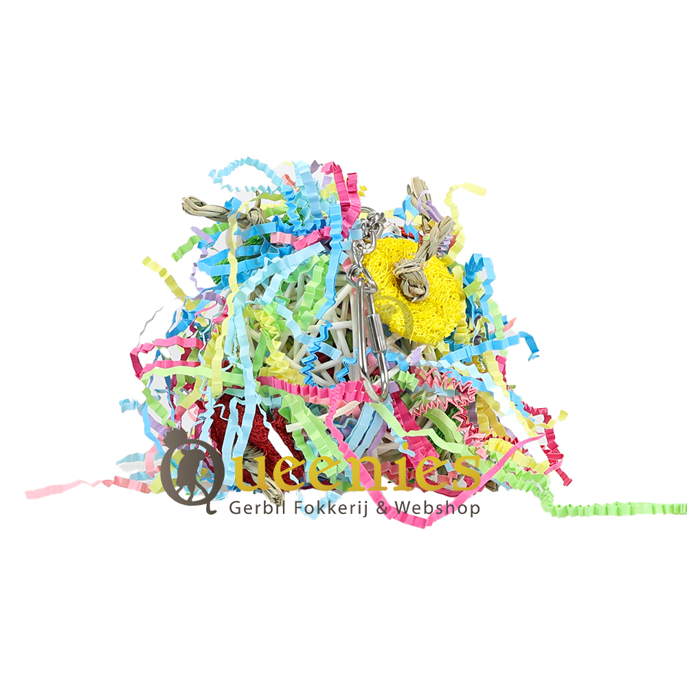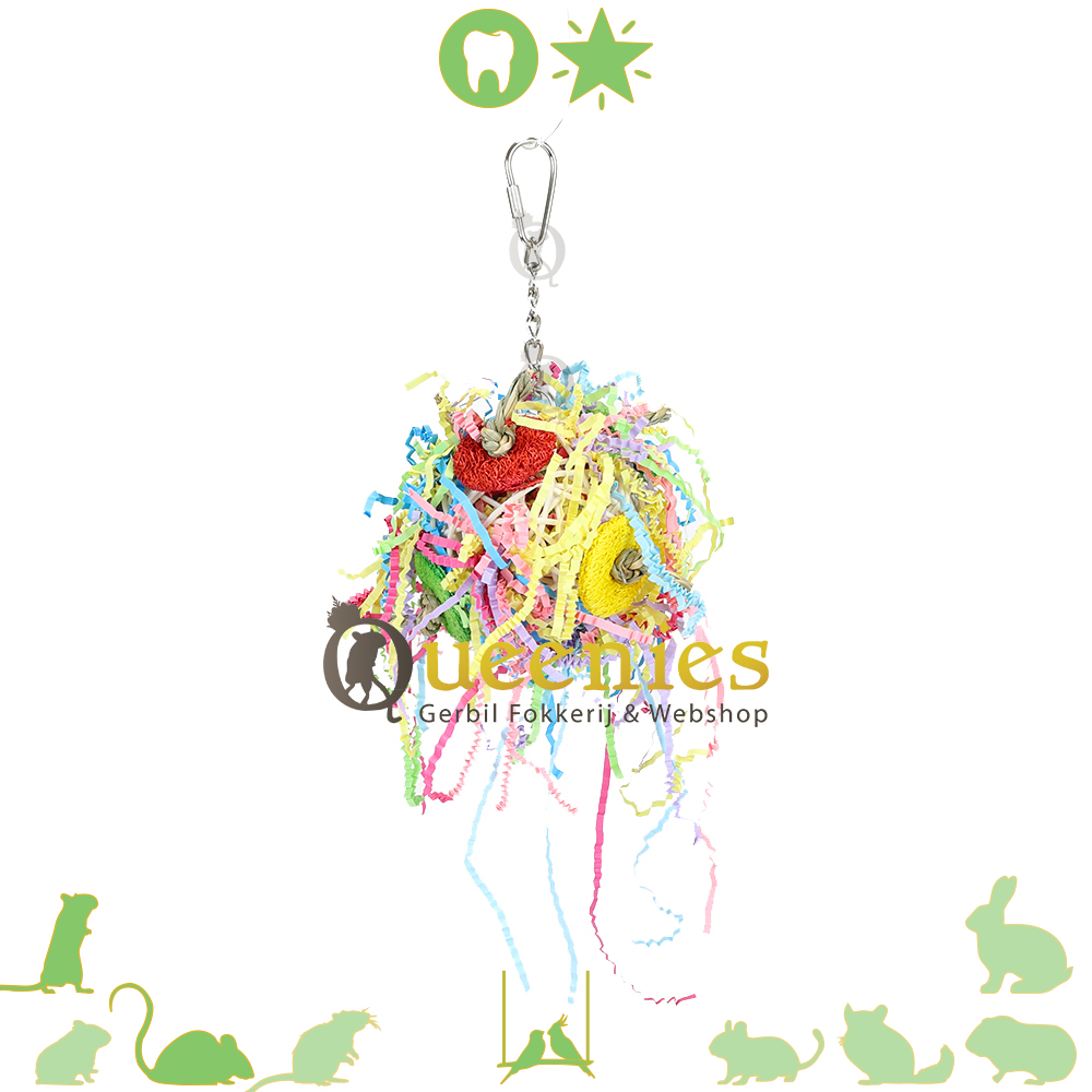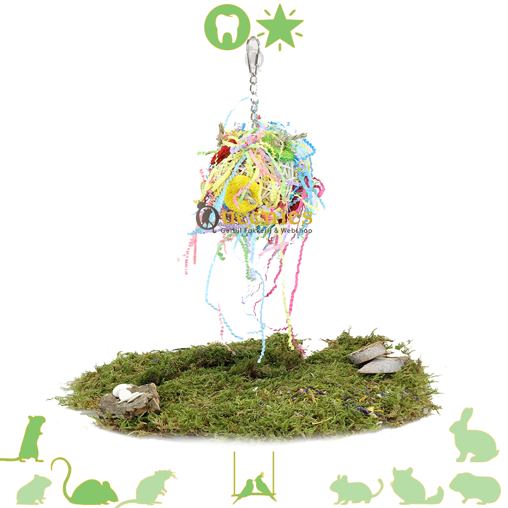 De gekleurde Sizzle Slierten steken uit de wilgenbal, ook is hier nog wat Loofah rondjes aan vast gemaakt om het speelgoed nog aantrekkelijker te maken voor uw huisdier. De Rotan Speelbal kan ook als Knaagbal worden gebruikt door Knaagdieren zoals een Muis of Gerbil. Door de gevlochten Wilgentakken waar de Speelbal van is gemaakt kunnen Gerbils, Muizen en andere Knaagdieren lekker aan de bal knagen. Dit helpt niet alleen mee om de tanden van de Gerbils op een natuurlijke manier te slijten, maar het houdt de Gerbils ook bezig. De Rotan Speelbal is ook makkelijk om op te hangen door de bijgeleverde karabijnhaak. Door het speelgoed op te hangen moeten Gerbils meer moeite doen om erbij te komen.