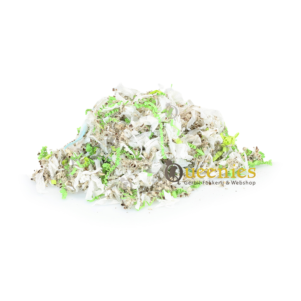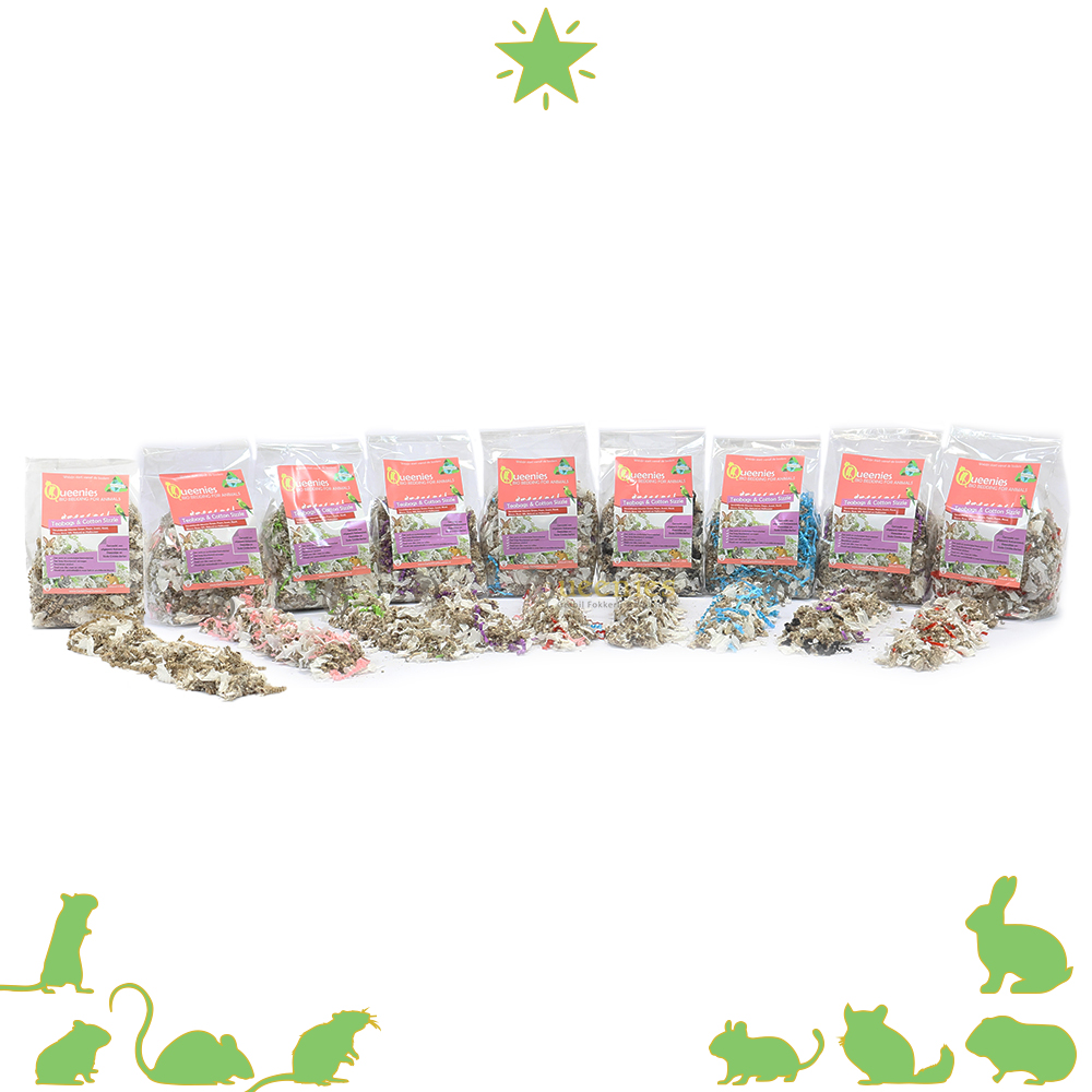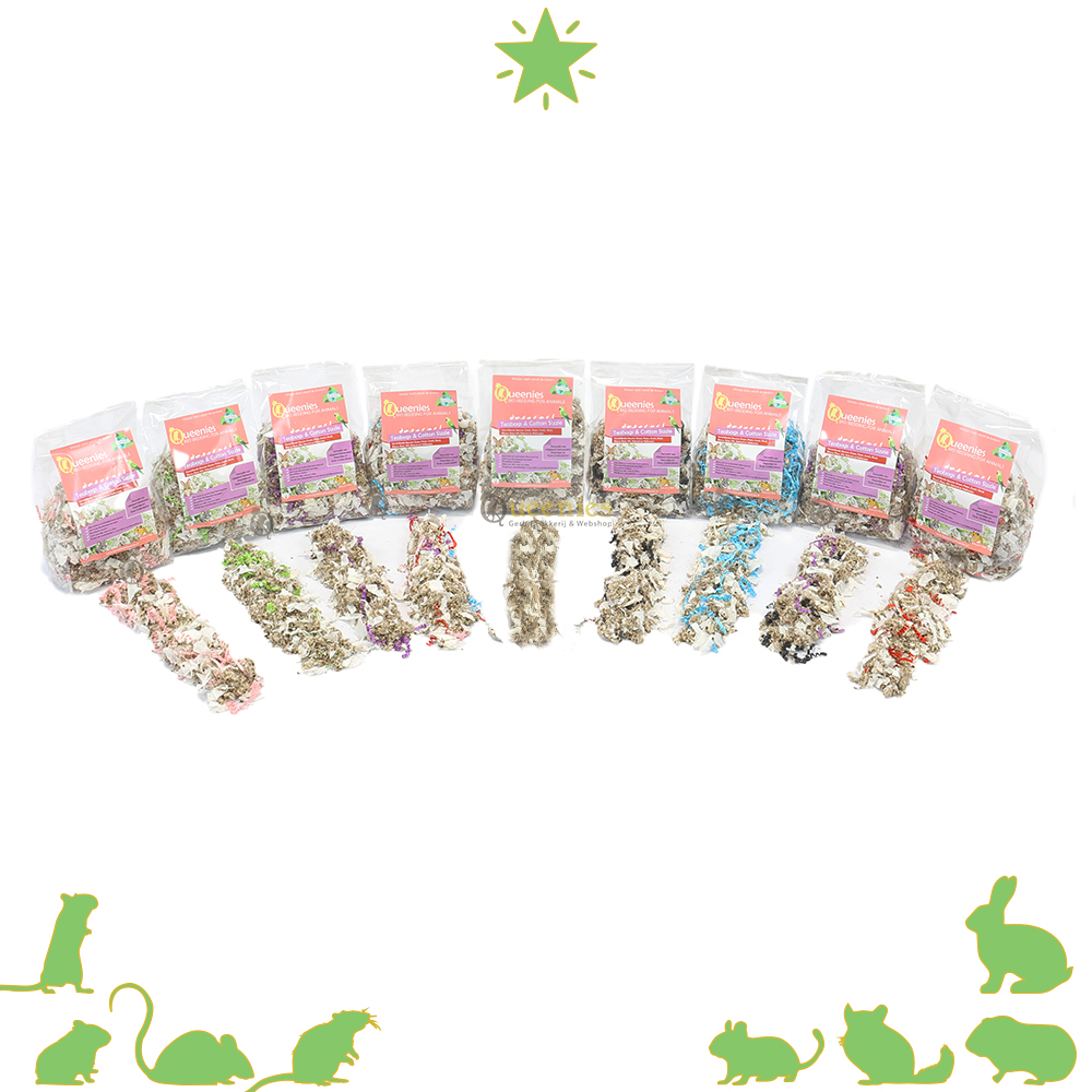 Inhoud: 3 Gemaakt van: Spierwitte theezakjes( 30%), Cotton Comfort ( 50% ) Colours (10%) en Sizzle Crinkle (10%). Land van oorsprong: Nederland Bedding: Doe een behoorlijke hoeveelheid in de kooi, hamsters en gerbils hebben minstens 20 cm nestmateriaal of zachte bedding nodig om zich in te graven. Bij muizen en ratten mag het wat minder. Nestmateriaal: Een behoorlijke handvol op de bestaande bedding zodat ze kunnen schuilen.