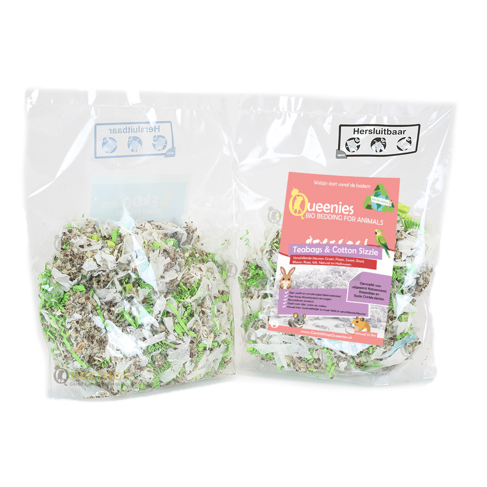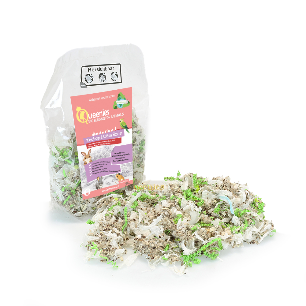 De Teabags & Cotton Sizzle 3 liter is een Cotton Comfort Nestmateriaal met Sizzle en Theezakjes voor Knaagdieren en Konijnen. Dit mengsel is zowel absorberend, als speels, als warm en comfortabel voor Knaagdieren zoals Gerbils en Hamsters. Daarnaast is het veilig doordat er gebruik wordt gemaakt van korte stukjes Theezakjes, Sizzle en Colours. Bij andere merken kunt u zien dat er lange slierten Teabags gebruikt worden, dit is zeer gevaarlijk voor Knaagdieren.