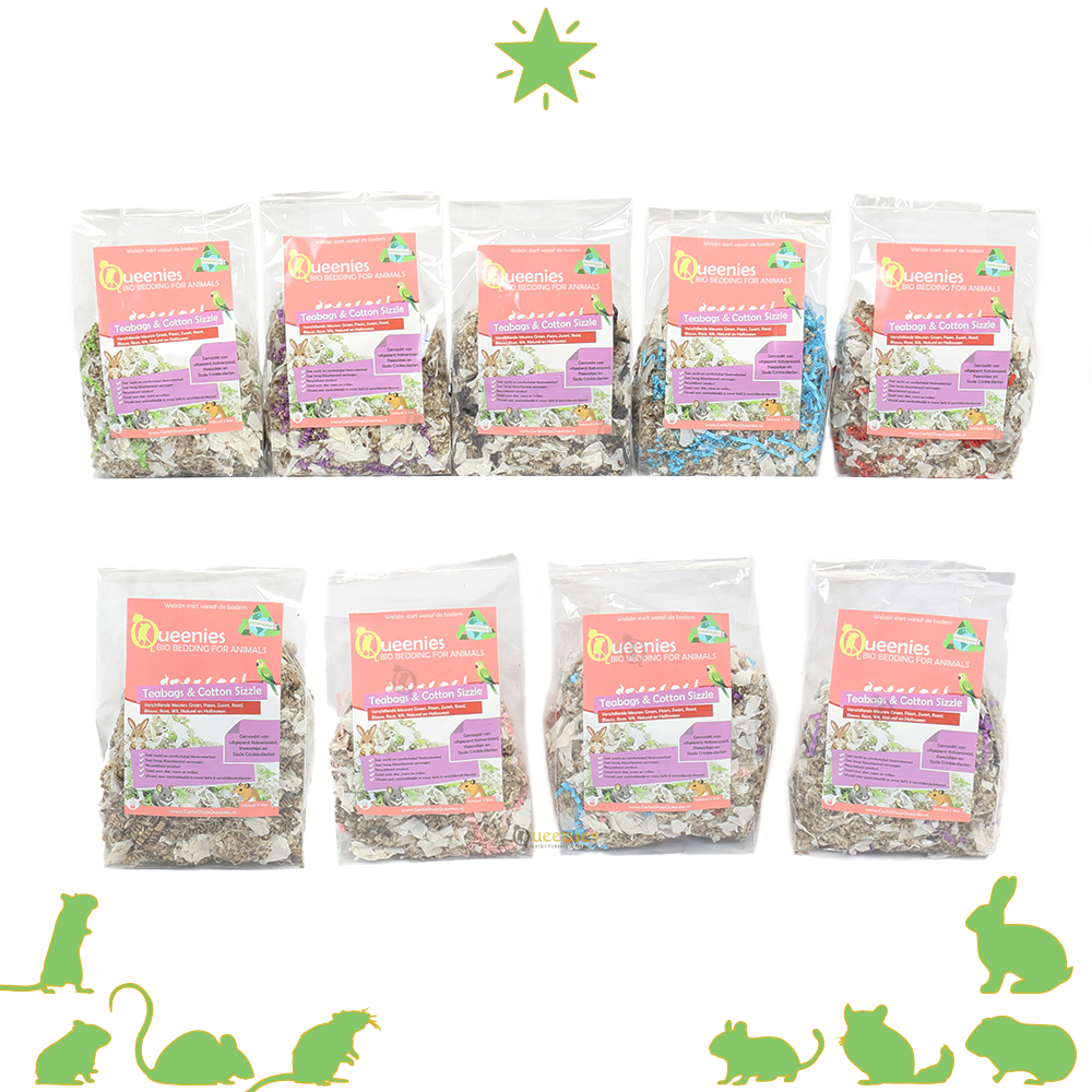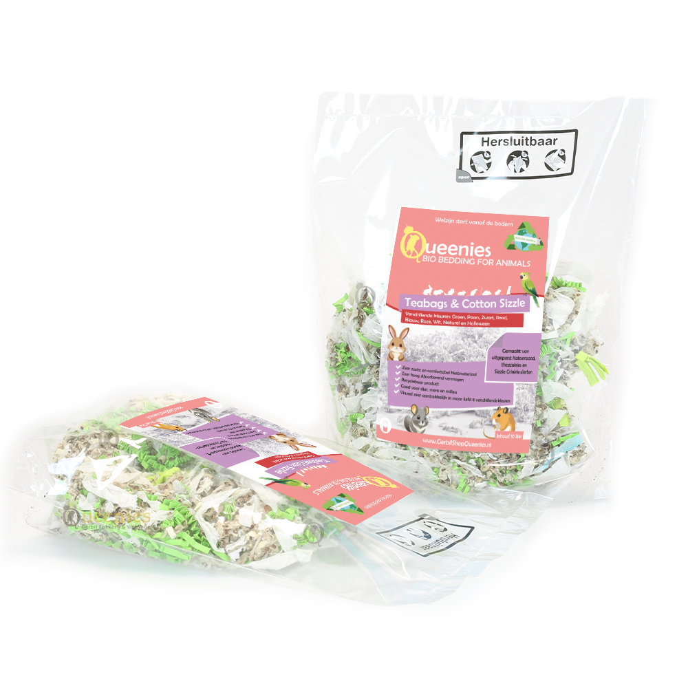 De Teabags & Cotton Sizzle 3 liter is geschikt voor alle kleine en grote Knaagdieren zoals Dwerghamsters, Gerbils, Ratten, Muizen, Degoes, Chinchilla's, Cavia's, Fretten en Konijnen. Gezien de geringe inhoud zullen we dit niet aanraden voor grotere Knaagdieren. het is een handzame verpakking die direct in het Knaagdieren Terrarium geplaatst kan worden bij kleine Knagers zoals de Gerbil, Hamster en Muis.