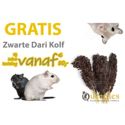 Een gratis Proefverpakking van de verrukkelijke Zwarte Dari Kolf van Queenies. Een product wat bij iedere Gerbil of Hamster als zoete koek naar binnen gaat. Een product wat we al jaren kennen als het gaat om de Rode Dari Kolf van Jr Farm. De Wij geven hier een proefverpakking van weg in de zwarte variant. Een hit bij ieder Knaagdier of Konijn die ook tegelijk het Terrarium / Gerbilarium leuk opfleurt. Verrijk de huisvesting van uw dier. De Zwarte Dari Kolf is een gezonde werkgelegenheid die het instinct van uw huisdier activeert doordat dit voelt als thuiskomen voor Knaagdieren en Vogels. De Dari Dari Kolf geeft uw Knaagdier een energieboost, is vetarm en rijk aan vezels en eiwitten. Veel gebruikt bij Hamsterscaping vanwege het natuurlijke effect wat u meegeeft aan de huisvesting van uw Knaagdier.