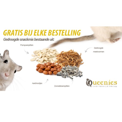 Wij hebben gekozen voor een mengeling van zonnebloempitten, pompoenpitten, gedroogde meelwormen en aardnootjes, met een hele bewust reden. Deze 4 snacks zijn de toppers allertijden bij Gerbils! Deze 4 snacks mogen eigenlijk nooit in uw snackkast voor gerbils ontbreken. Bestellingen tot 49 euro ontvangt u deze lekkere mengeling. bestellingen boven de 49 euro ontvangt u ander cadeau van Queenies. Momenteel is dat de gratis Trosgierst