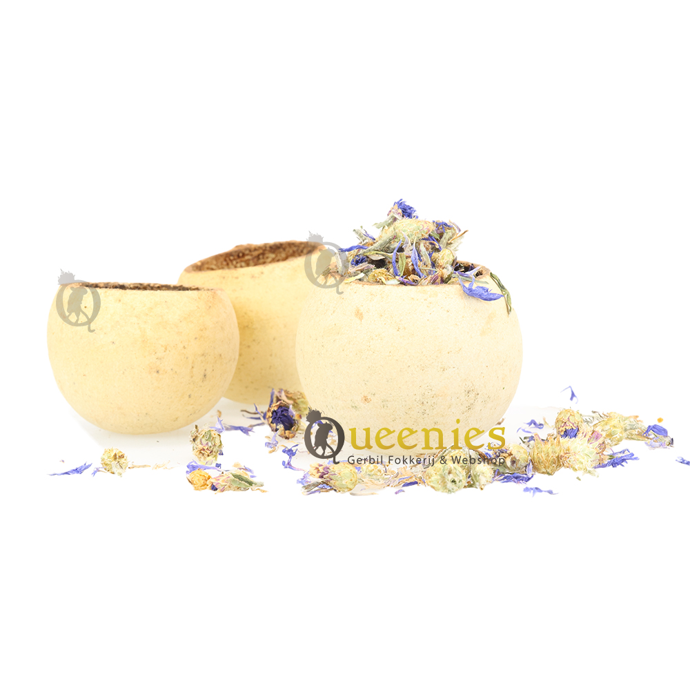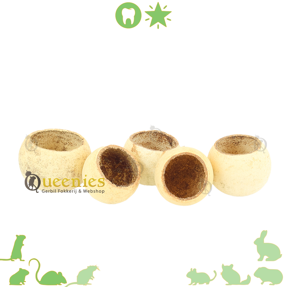 Een Cup is de gedroogde schil van een exotische fruitboom in India. Deze cups zijn een houtige pod die prima te gebruiken is in een knaagdieren terrarium of terrarium voor hamsters die wordt gebruikt bij hamsterscaping. Door de structuur en vorm kunt u het voer of snacks voor gerbils en hamsters er goed in verstoppen en stiumuleert het uw gerbil of hamster om zijn eigen voedsel te vinden. Dit noemen we foerageren. Foerageren is de biologische term die gebruikt wordt voor het regelmatig terugkerend zoeken en vinden van voedsel door dieren. Daarnaast zit de Cups vol met goede tannines, sporenelementen en natuurlijke vitaminen. Voor knaagdieren is dit minder relevant, zij zullen deze vitamines niet uit de noot kunnen krijgen. Dit is meer voor aquariums relevant.