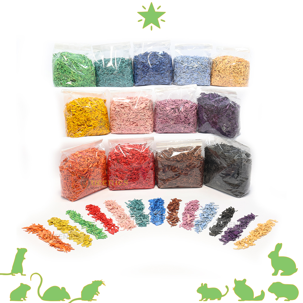 Probeer onze Bio Bedding Color Wood en Kleur de Hamsterscape met gekleurde bodembedekking voor Knaagdieren! Brengt kleur aan in de leefomgeving van uw Knaagdier met ons prachtig gekleurde hout! Verkrijgbaar in maar liefst 9 kleuren! Dit vrolijk gekleurde Color Wood vormt een veilige en natuurlijke toevoeging aan het Hamster Terrarium bij Hamsterscaping en verrijkt de wereld van uw huisdier. Ons Color Wood is door middel van een milieuvriendelijke methode gekleurd waarbij het hout eerst aan een hoge temperatuurbehandeling is onderworpen. Dit proces zorgt ervoor dat het hout volledig vrij is van bacteriën, schimmels en ongedierte. Wij garanderen de veiligheid voor uw huisdier!